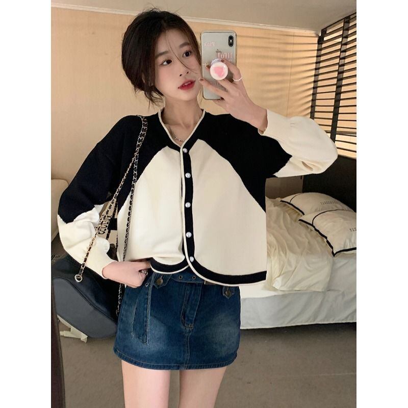 ブラック ホワイト コントラスト V ネック長袖ニット カーディガン Y2k セーター セーター プル Fairycore 美学グランジ コート ロング Vネック