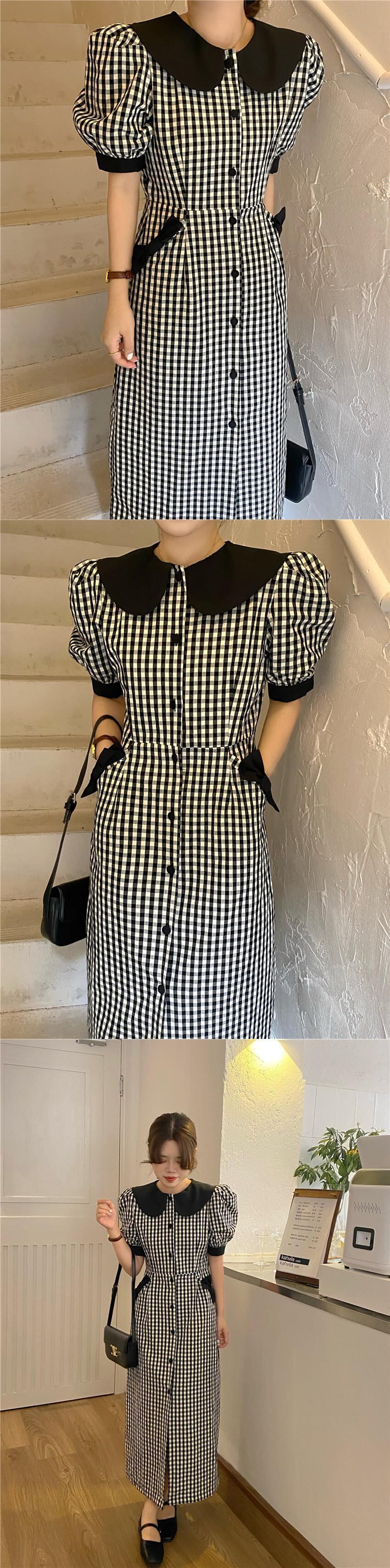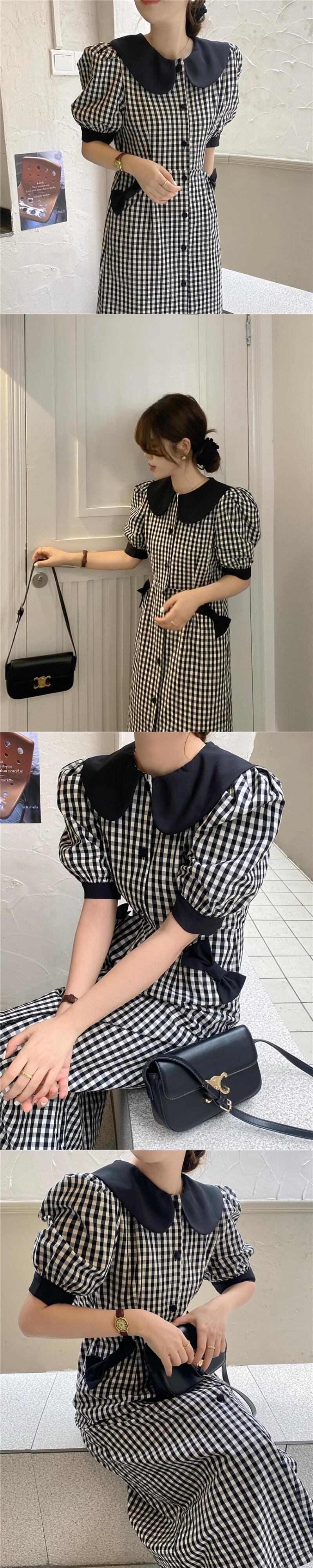 スリムウエストコントラストドールネックリボン黒チェック柄ドレスペンシル Vestidos デボディコンスタイル半袖 ショート ブラック ハーフスリーブ