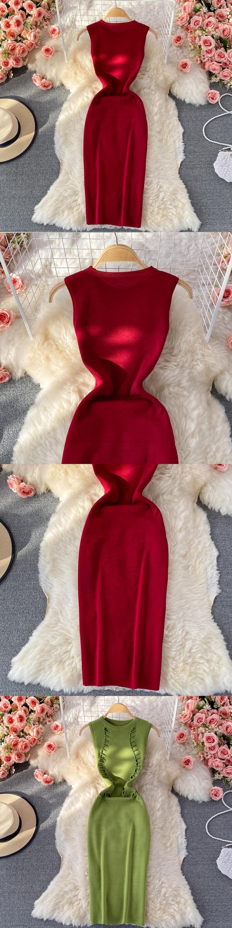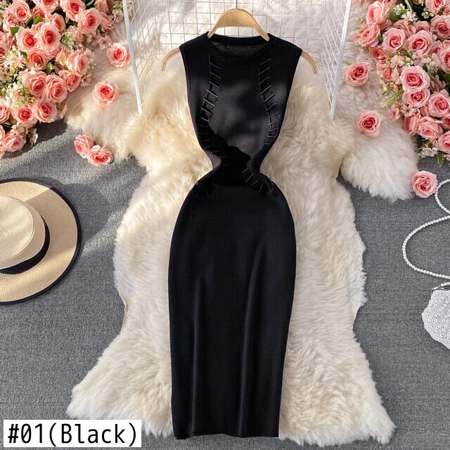 スリム弾性ボディコンドレスローブ Vestidos セクシー中空 O ネックタンク黒ペンシルドレスミニニット無料 ブラック エラスティック 伸縮 Oネック