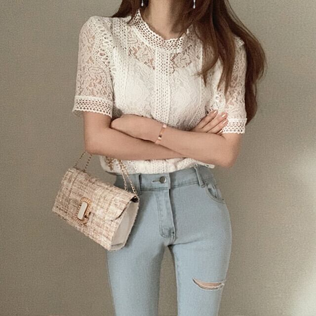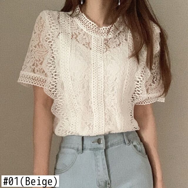 De Moda かぎ針編み中空黒レースシャツ半袖トップクロップトップスタイルブラウス ショート ブラック ハーフスリーブ