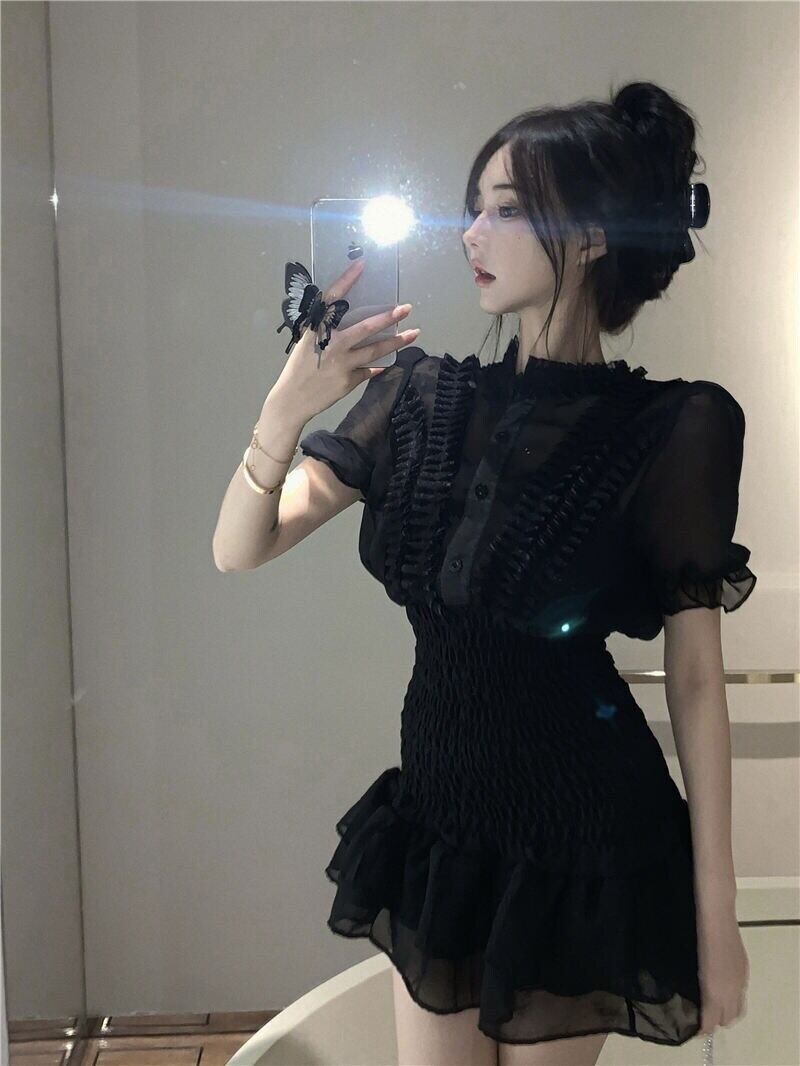 セクシーウエストプリーツ A ライン黒ケーキドレスセクシー Vestidos デ透視メッシュパーティーサマードレスフリル Y2K ミニ ブラック 夏物 Aライン