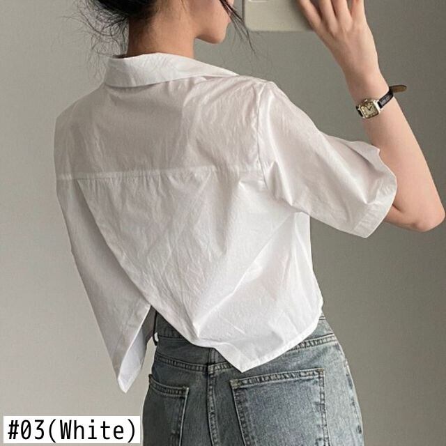 ニッチセンススプリットバックバックレスウエストショートホワイトシャツトップデモーダサマーブラウスシャツ 夏物