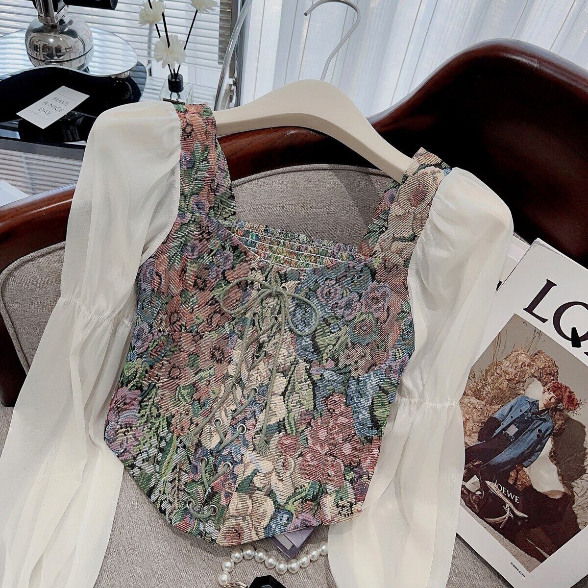 刺繍油絵シャツスクエア花柄トップスクロップレースアップフレアスリーブブラウスコートスタイルシャツ レッド スクウェア