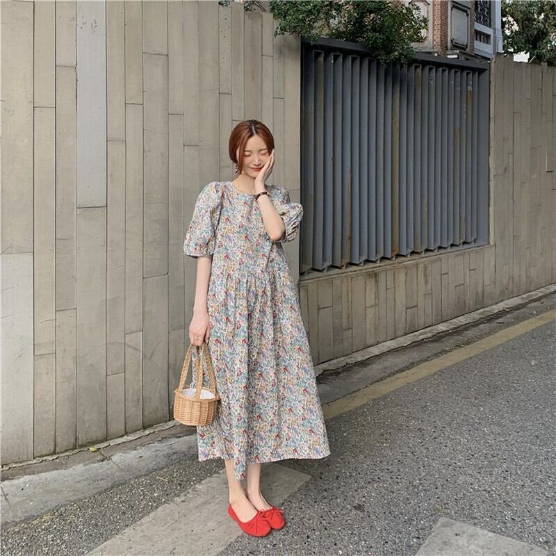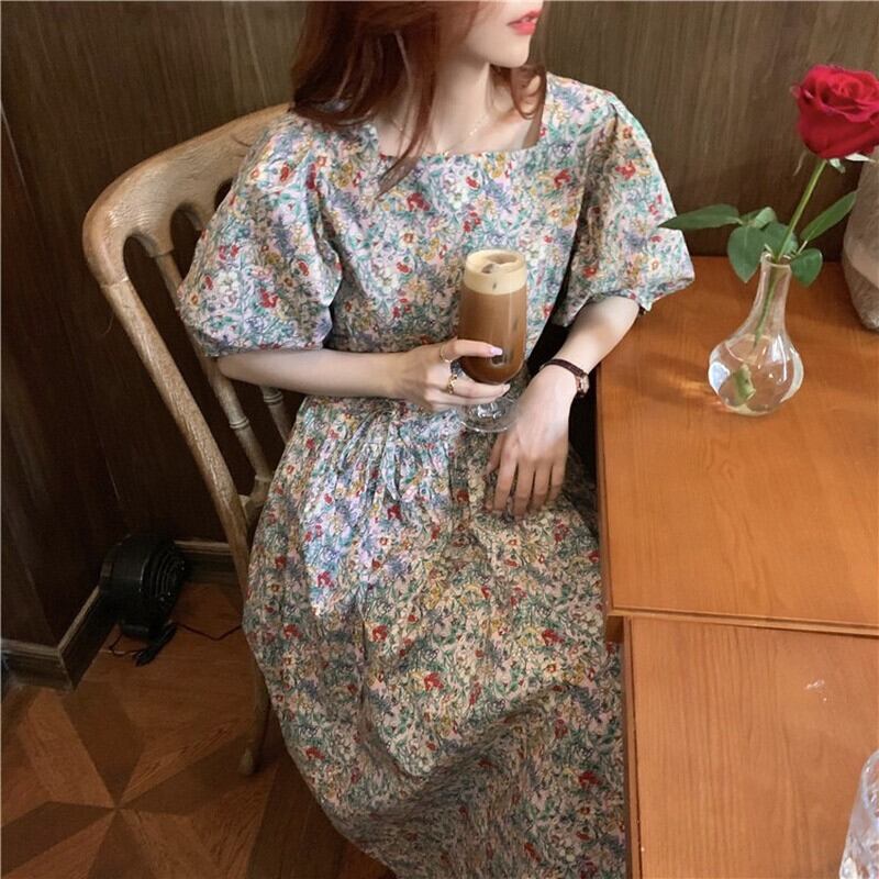 花柄プリントドレスフレンチスタイルハーフパフスリーブ春夏ガールテンダードレス Vestidos スプリング 春物 サマー 夏物
