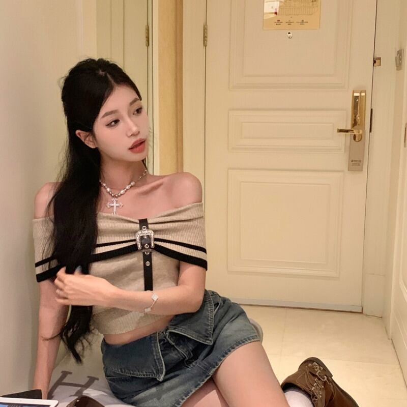 Fairycore 美学グランジセクシーセンススパイシーガール斜め肩ニット Tシャツオフショルダートップクロップ Tシャツ Y2k Tシャツ
