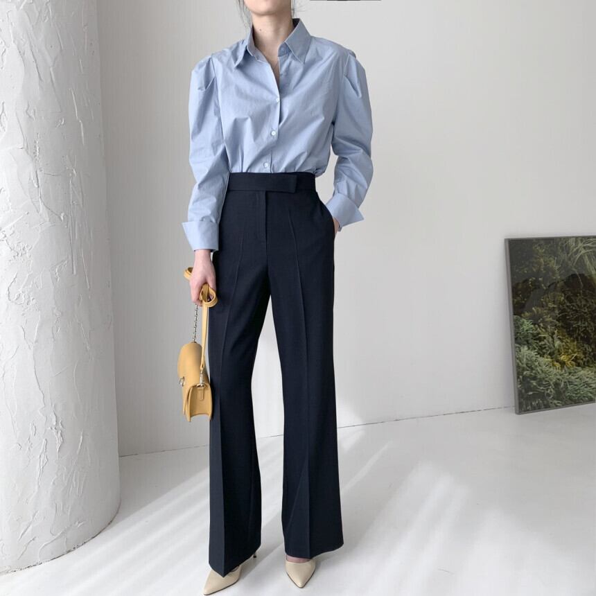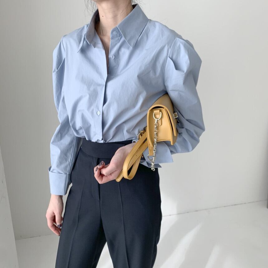 ミニマリスト気質パフワイルドシングルブレストルーズプリーツブラウストップスオフィスレディブルーホワイトシャツ 会社 学校 通勤や通学にも