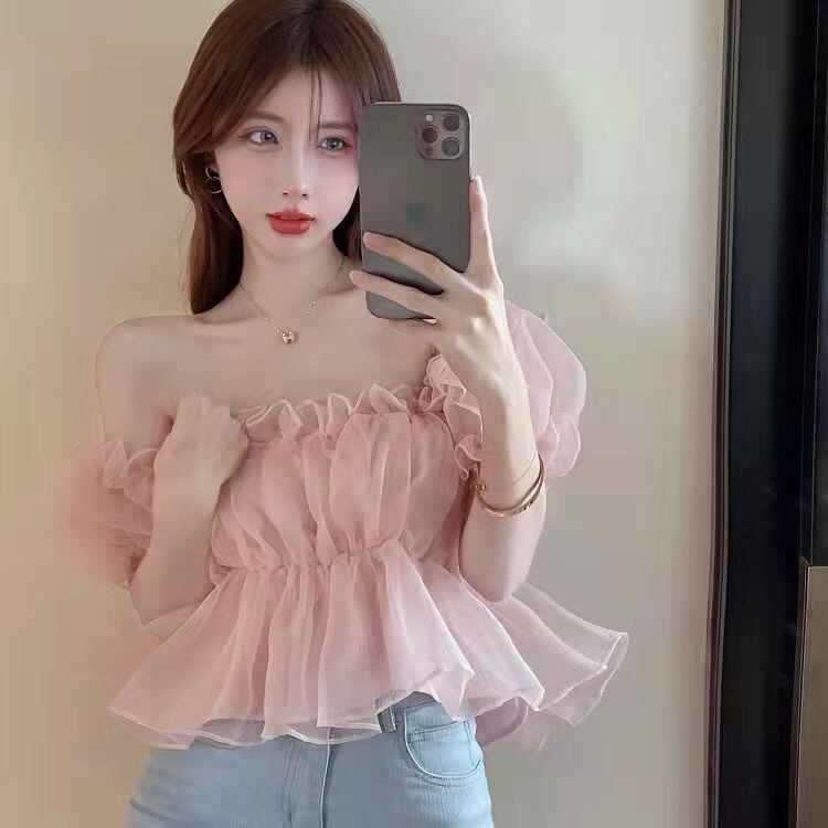De Moda スリムオフショルダートップスウィートピンクシフォンシャツクロップシャツメッシュブラウスオフィス 大人ガーリー キュート カジュアル 会社 学校 通勤や通学にも