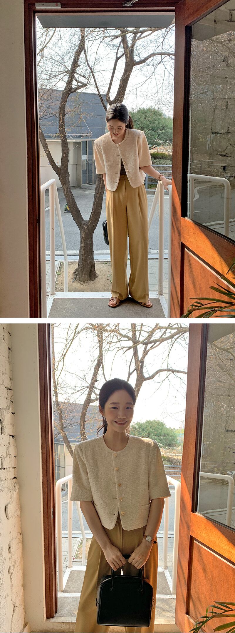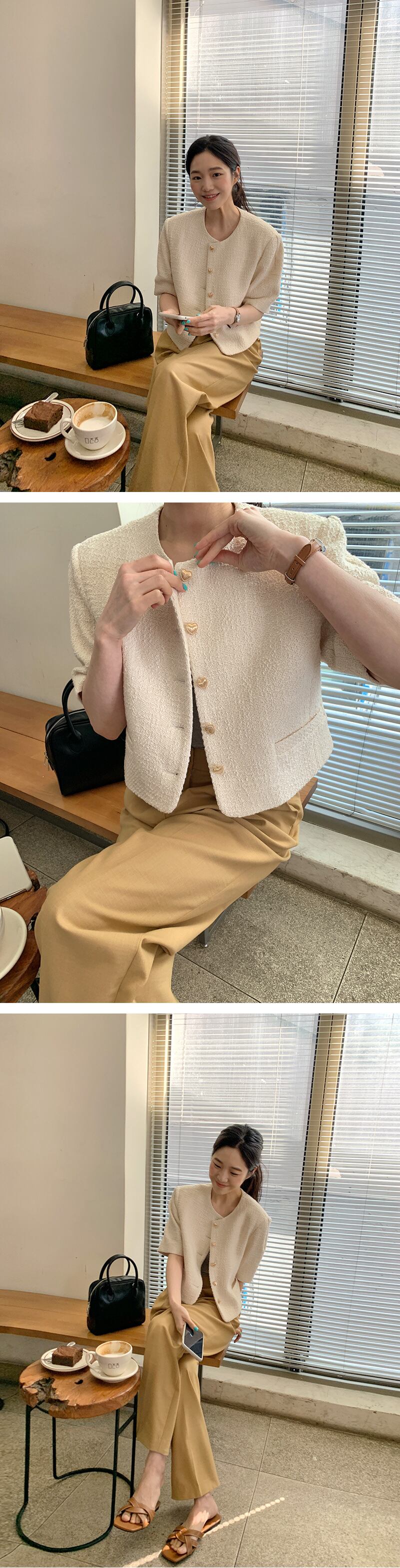 シックラブボタンルーズ半袖ツイードジャケットセンスカーディガンチャケータサマークロップテーラードコート ショート レッド ハーフスリーブ 夏物