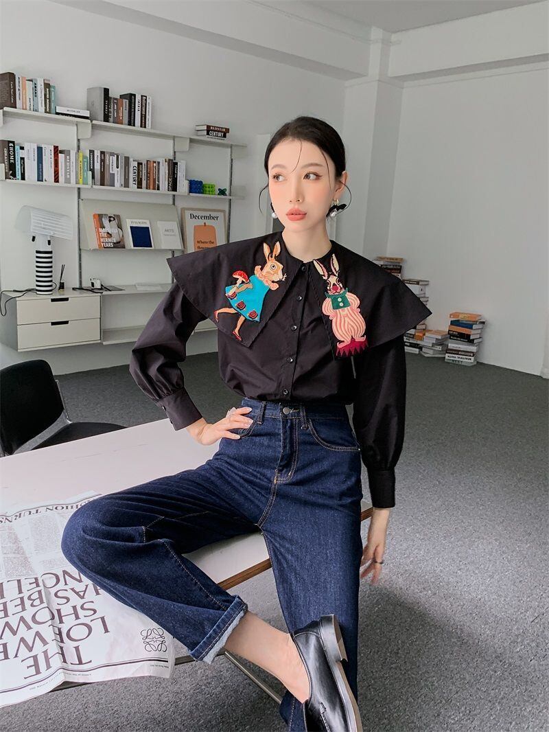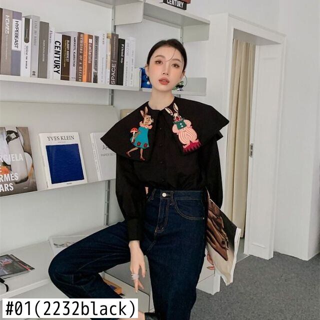 Y2k ブラウス センス 長袖 フリル かわいいウサギ ブラック シャツ 刺繍 トップ レディース ロング レッド 大人ガーリー スウィート キュート カジュアル