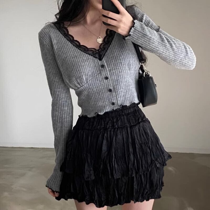 セクシーグレー丈カーディガン美学グランジフリルレースシャツプル V ネックセーターニット Tシャツトップコート Vネック