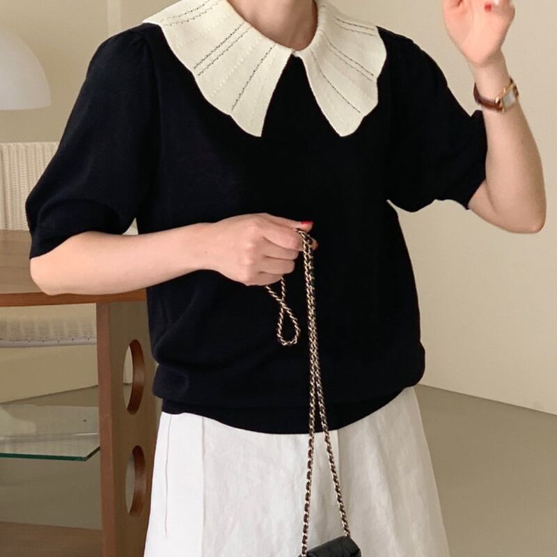 ルーズレトロコントラストセーター Y2k 服ジャンパープルオーバー半袖ニットトッププルニット黒セーター ショート ブラック ハーフスリーブ