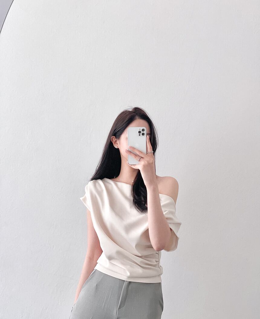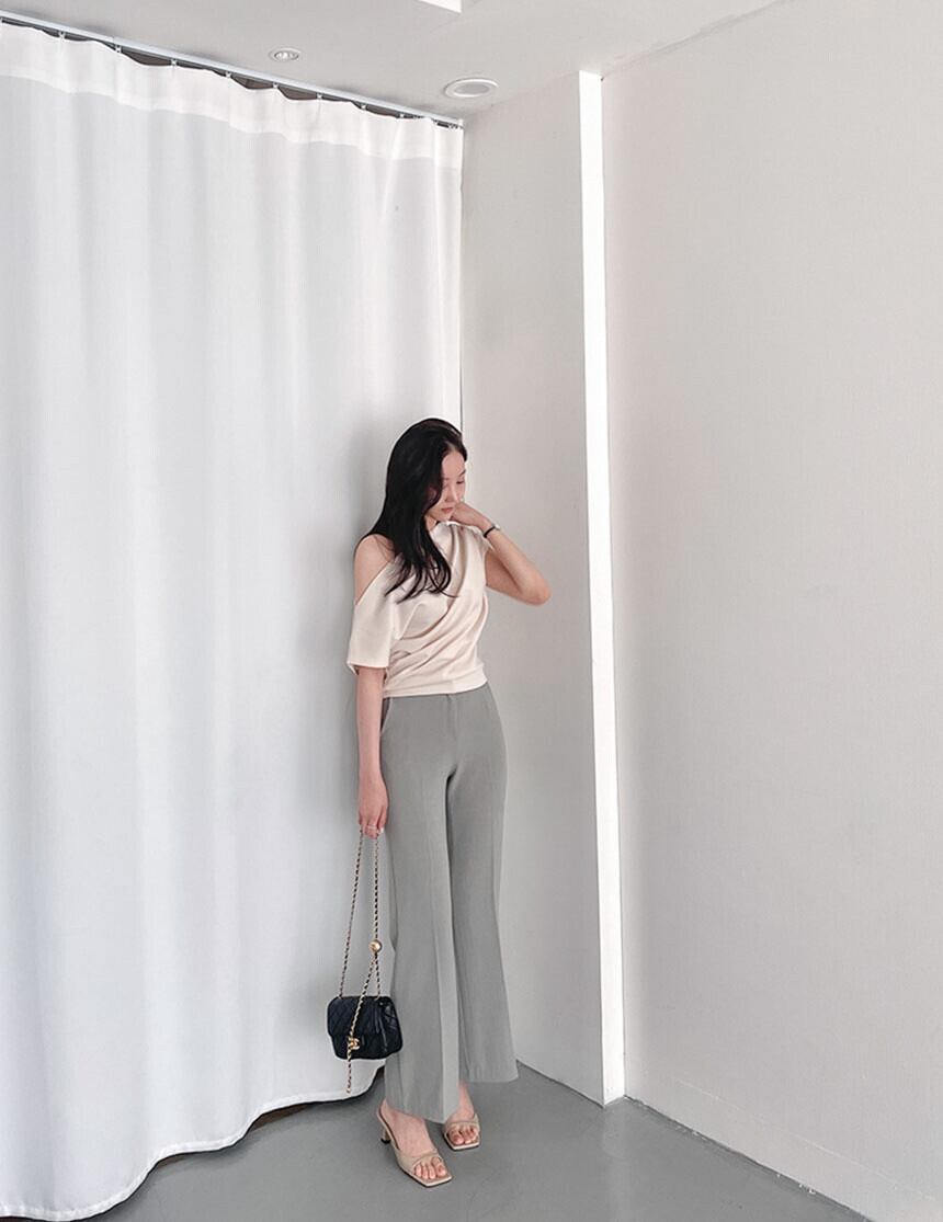 パイルカラーオフショルダークロップトップオフィスレディブラウススリムプリーツピンクシャツフレンチシャツ 会社 学校 通勤や通学にも