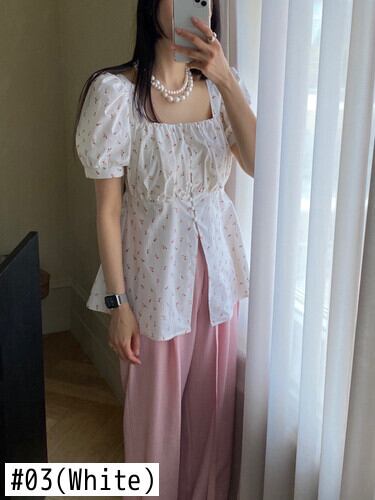 De Moda Sense スクエア 半袖 ブラック 花柄 シャツ スリット クロップトップ ブラウス シャツ ショート ハーフスリーブ スクウェア