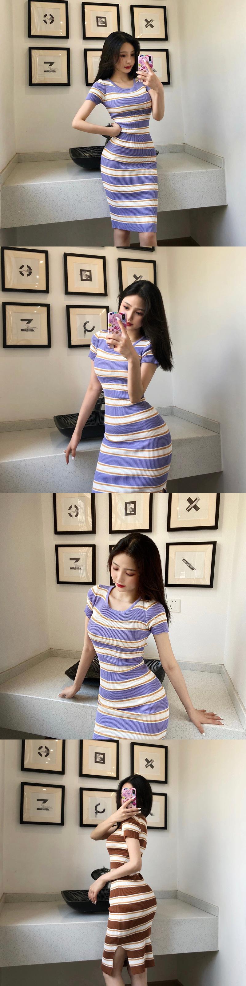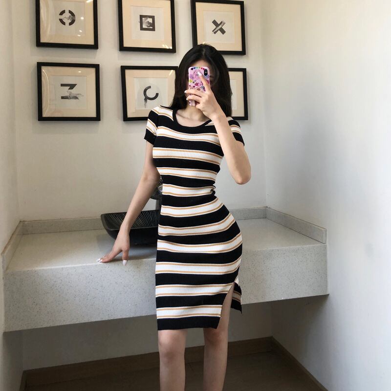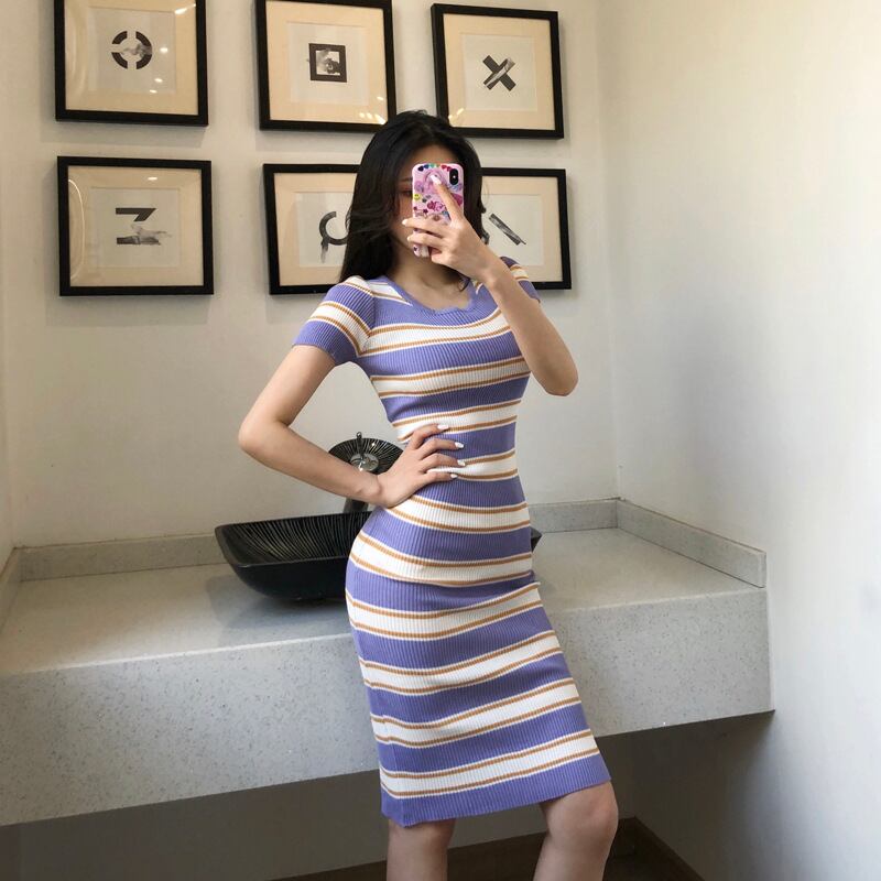 セクシー U ネック弾性ボディコン半袖ストライプドレスミニ Vestidos デサマーニットドレスペンシルセーター ショート ハーフスリーブ エラスティック 伸縮 夏物