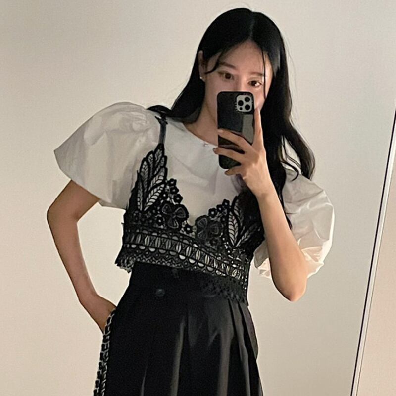 夏タンクトップキャミソール黒レースシャツ + パフ半袖グラフィック Tシャツ Ropa 綿 Tシャツ美的 Y2k Tシャツ 2 セット ショート ブラック コットン ハーフスリーブ サマー 夏物