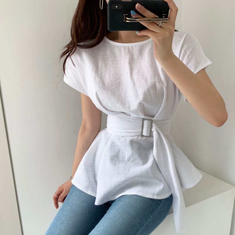 Sense Niche ソリッド プリーツ レースアップ フライング スリーブ O ネック シャツ ブラック ホワイト トップ ブラウス シャツ Oネック ソリッドカラー
