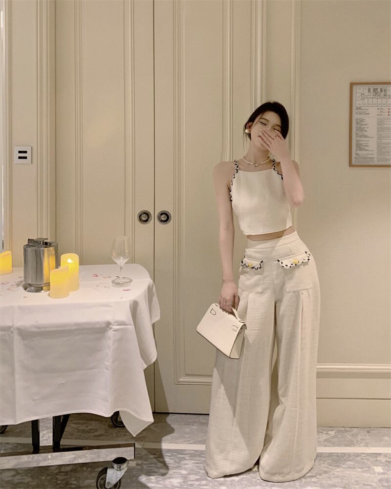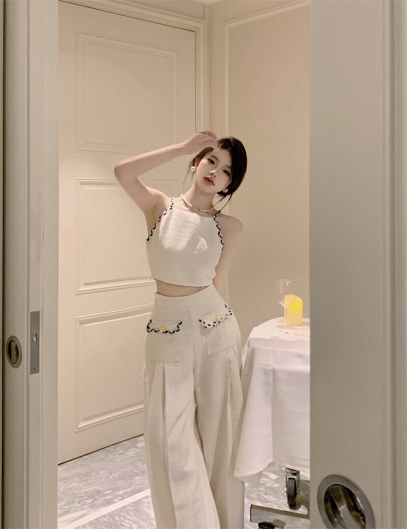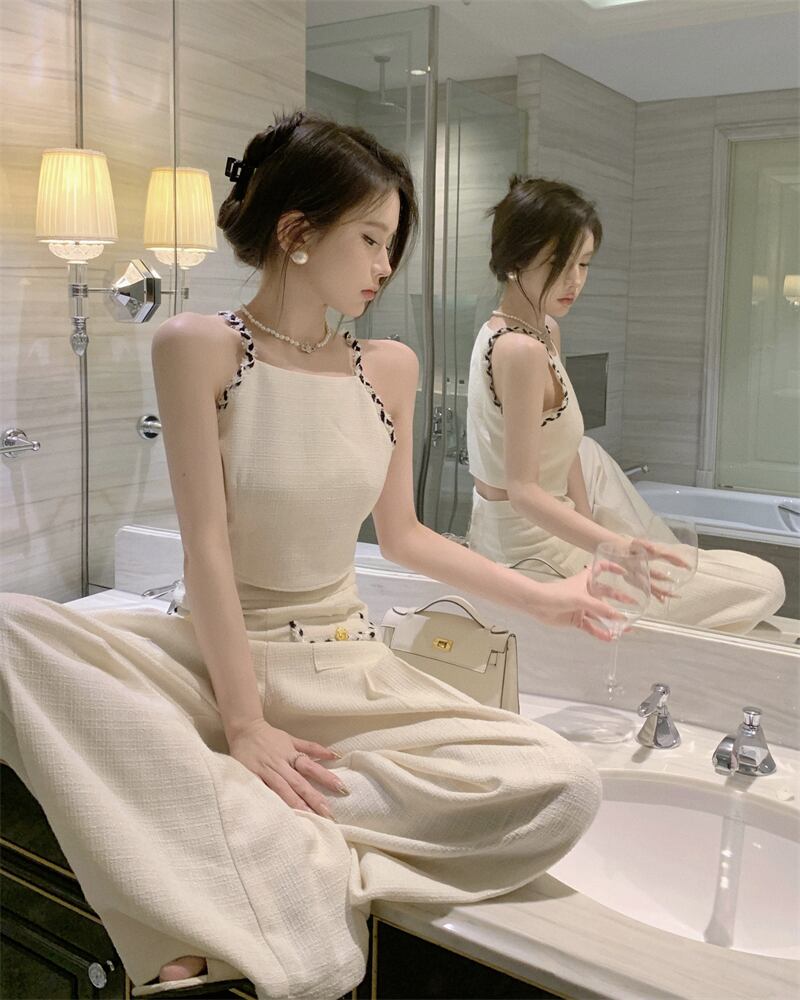 タンクトップキャミソールセクシー 2 ピースセットレディース衣装 Y2k ワイドレッグストレートパンツホルター Tシャツセクシーパンツセット ワイドパンツ