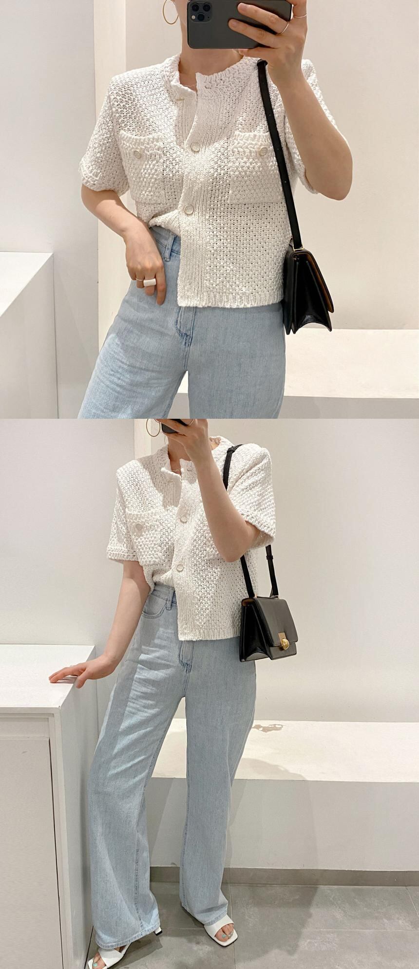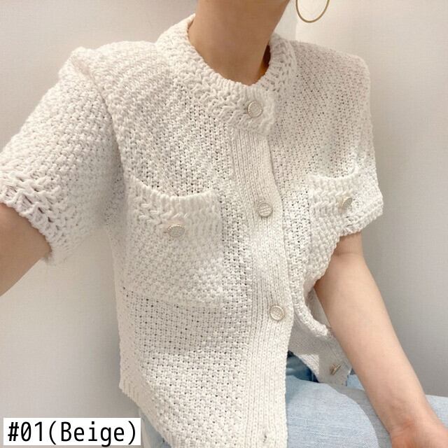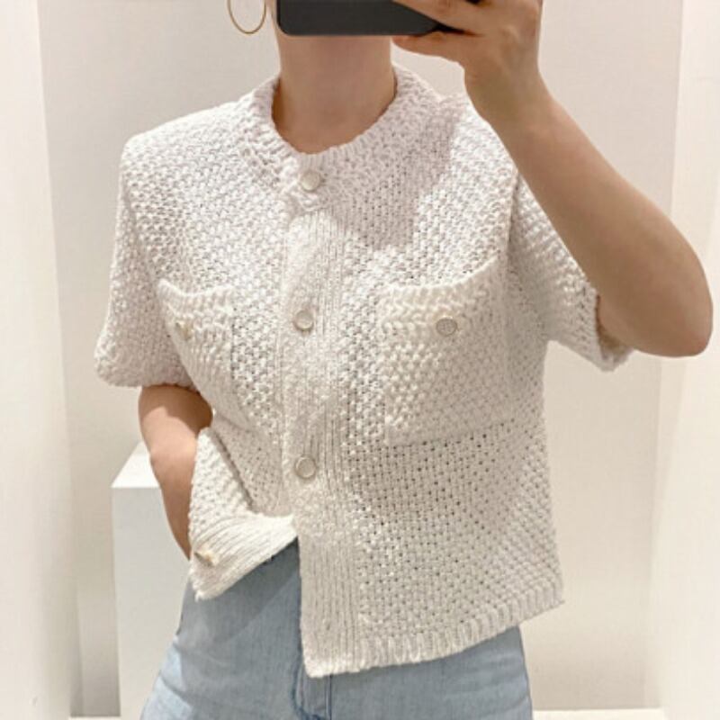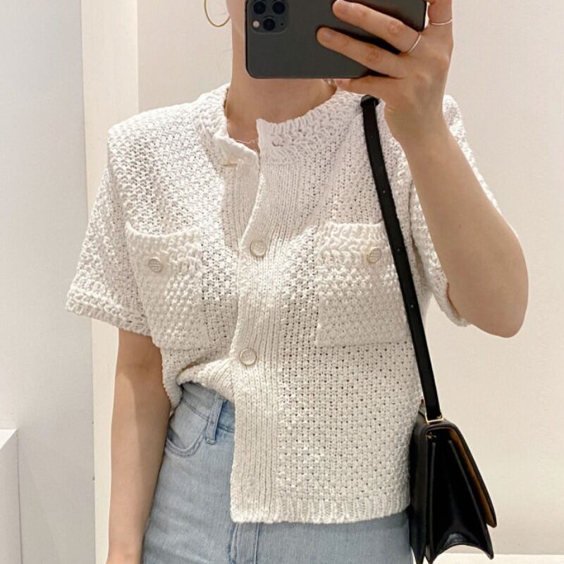 O ネック半袖ニットカーディガンルーズジャケット Chaquetas ボタンセーター中空コートポケット ショート ハーフスリーブ
