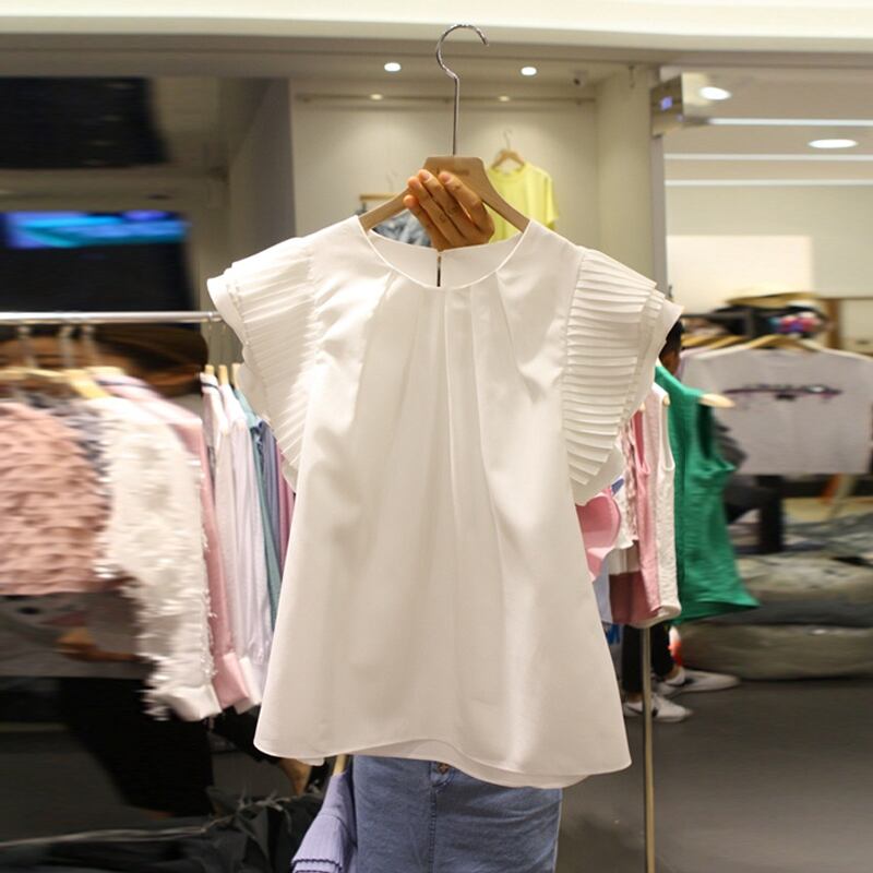 ソリッドホワイトブラックブラウスOネック半袖プリーツトップスファッションルーズシャツ ショート ハーフスリーブ ソリッドカラー