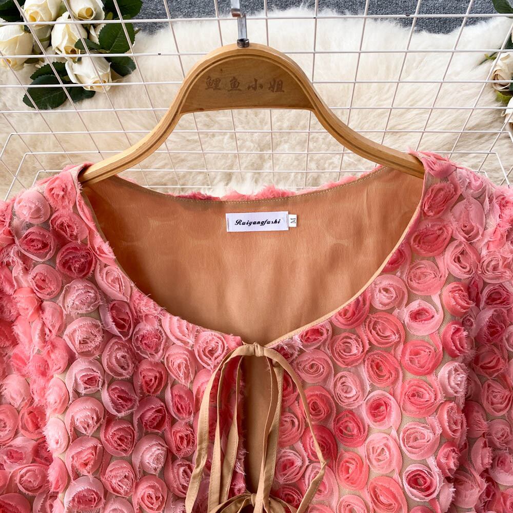 ファッション 3D 花セット夏半袖ネクタイミニトップ甘いウエストショートスカートストリート 2 枚スーツ ハーフスリーブ 大人ガーリー スウィート キュート カジュアル サマー 夏物 花柄