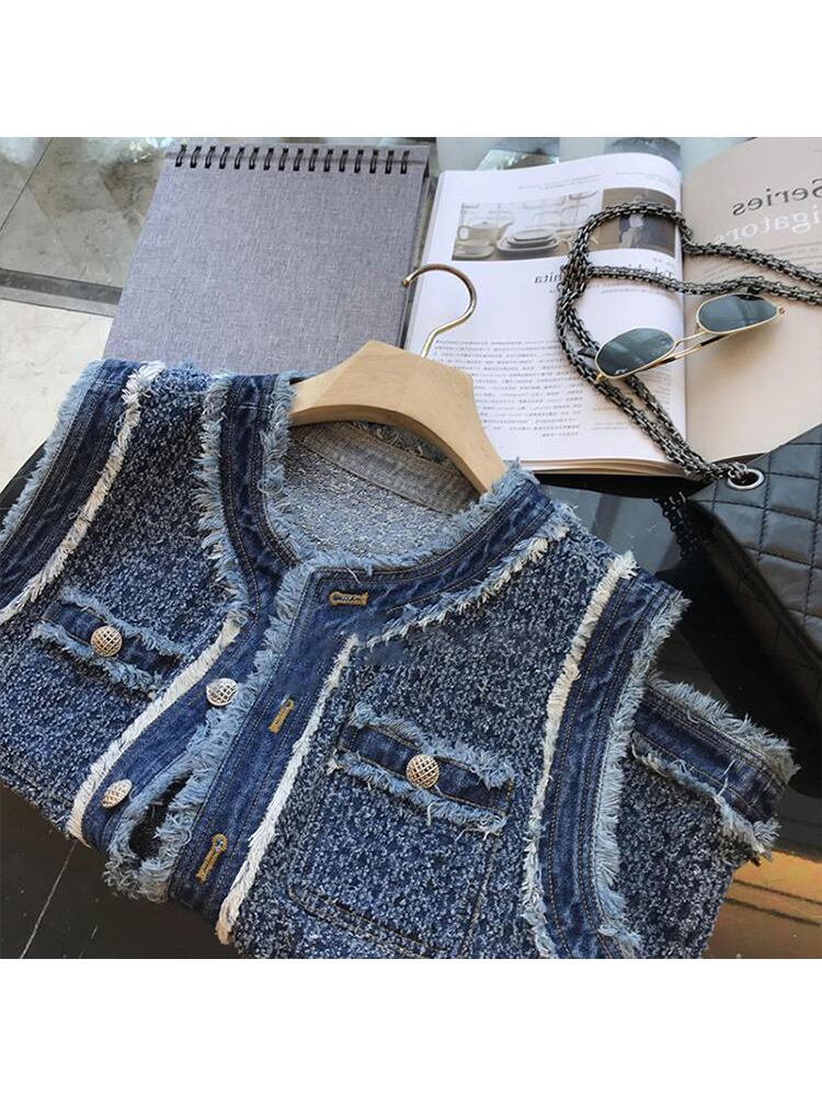 夏スタイル O ネックノースリーブデニムベストストリートスタイルブルー Y2K ルーズシングルブレストコート サマー 夏物 Oネック