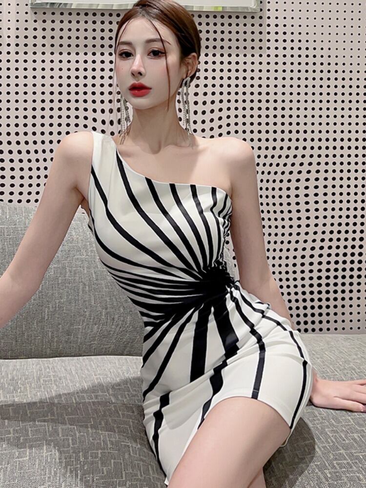 ボディコンドレス Vestidos セクシー斜め肩コントラストストライプドレススリムヒップラップローブ Y2k 夏ミニ サマー 夏物