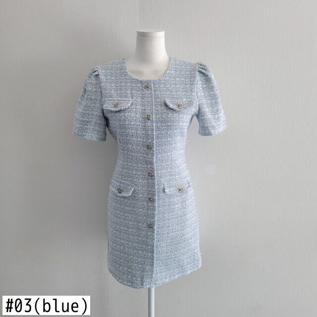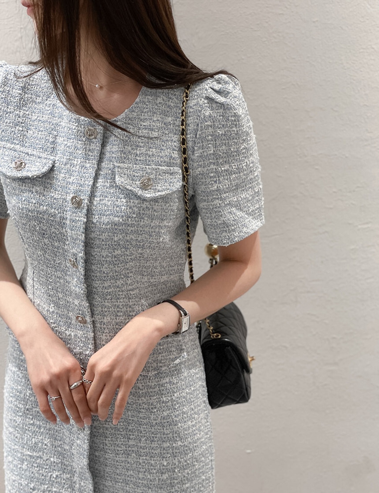Vestidos 気質バブルスリーブショートラウンドネックシックメタルボタンスリムピンクツイードドレスローブボディコンドレス Oネック