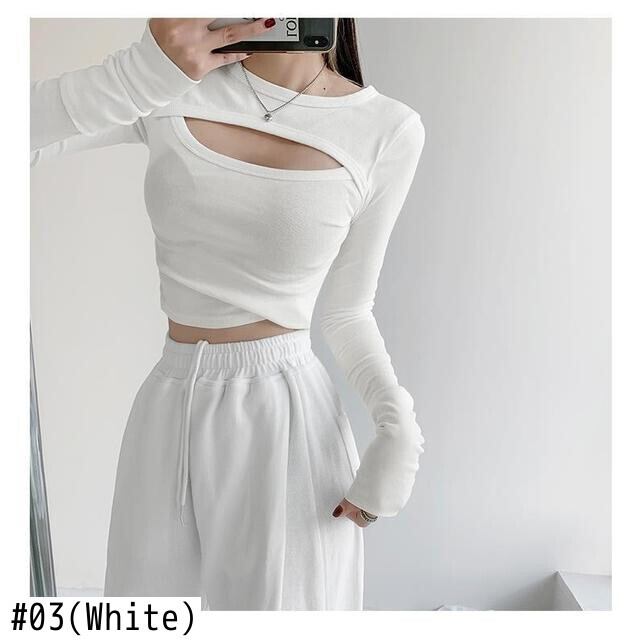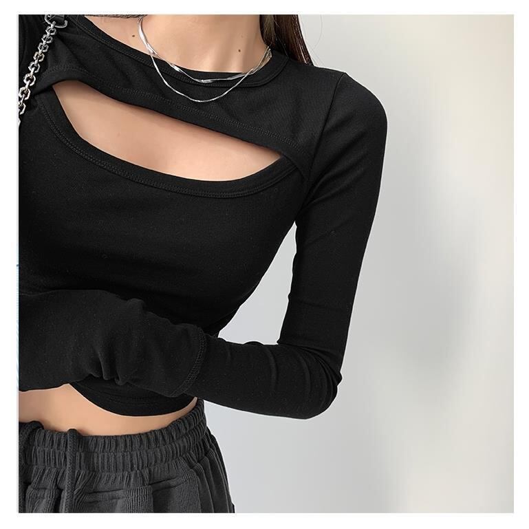 長袖 Tシャツセクシー中空アウト O ネッククロップトップスインホットガールズスタイリッシュストレッチストリート美学グランジ ロング Oネック ソリッドカラー