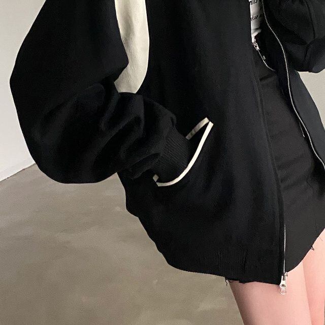 黒ボンバージャケットルーズコントラストジッパースウェット Chaquetas Y2k ストリートコート秋原宿 ブラック シャツ かわいい オータム 秋物