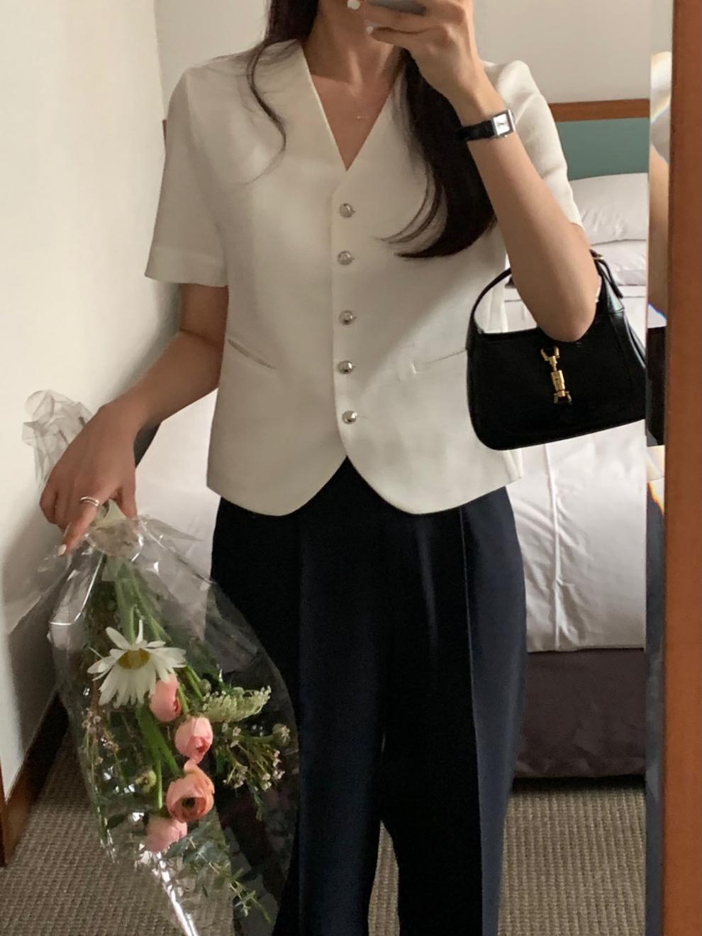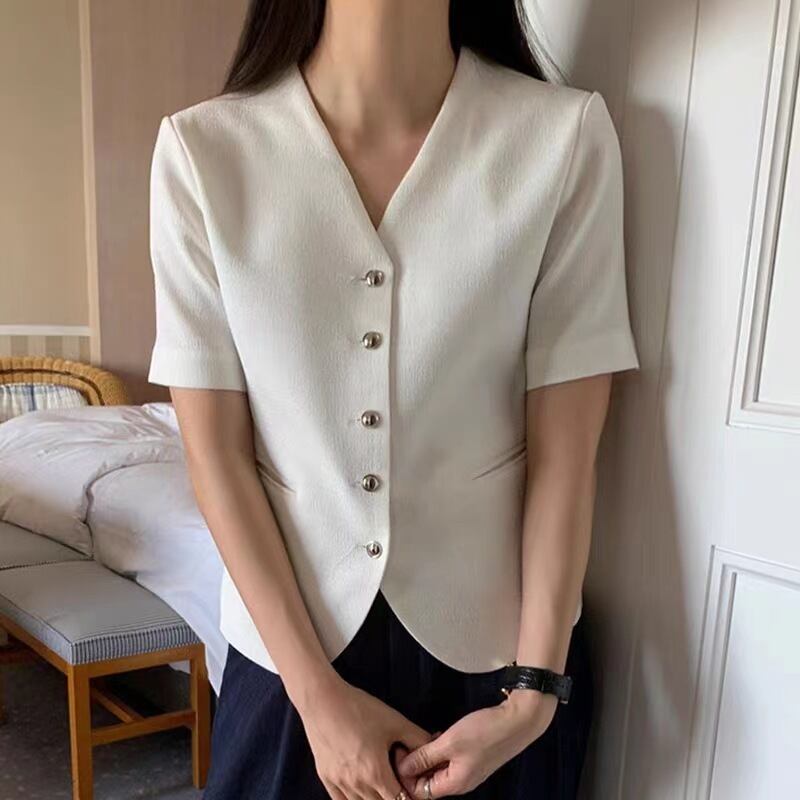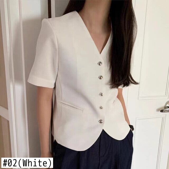 多用途 V ネック メタル シングルブレスト ルーズ 半袖 ジャケット チャケータス ホワイト ブレザー Feminino コート ショート ハーフスリーブ Vネック