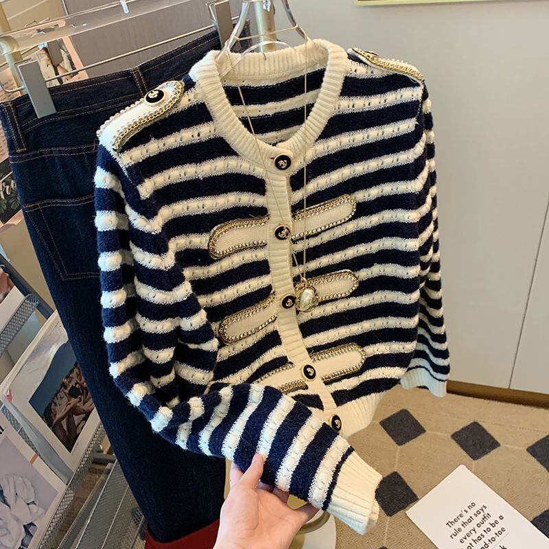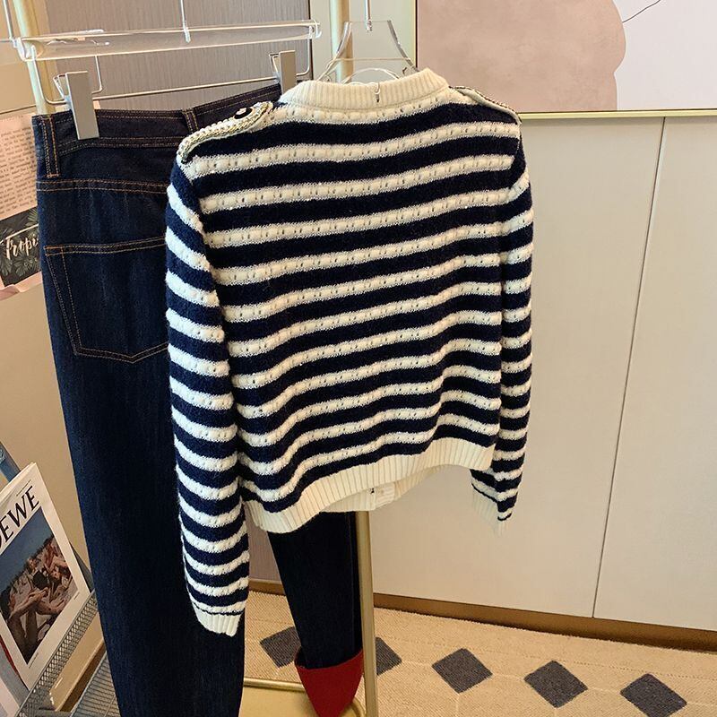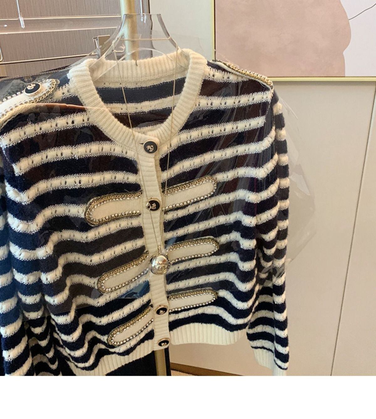 ニット Y2k 秋冬セータージャケット O ネックストライプコントラスト長袖アウターシングルブレストカーディガン ロング オータム 秋物 ウィンター 冬物 Oネック