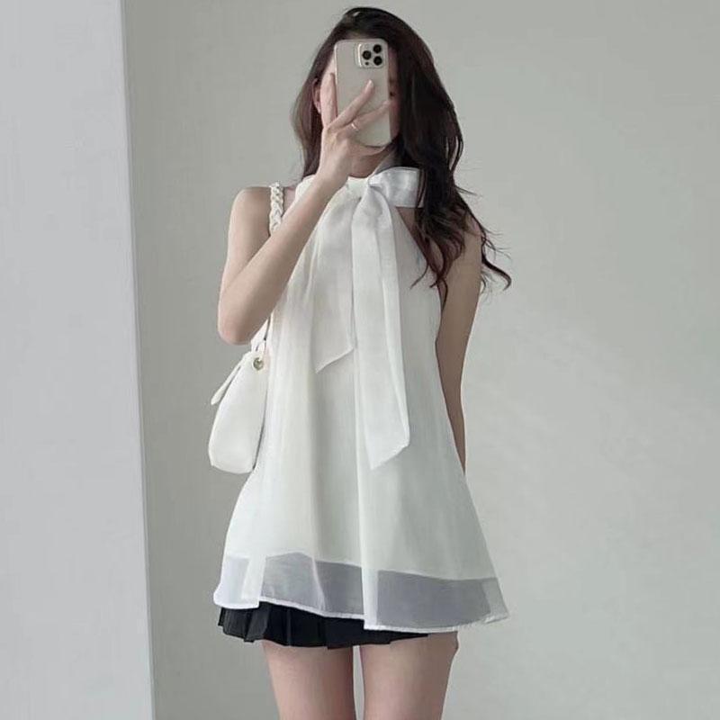 ホルターリボンレースアップノースリーブシャツトップデモーダブラックシフォンシャツブラウスシャツ