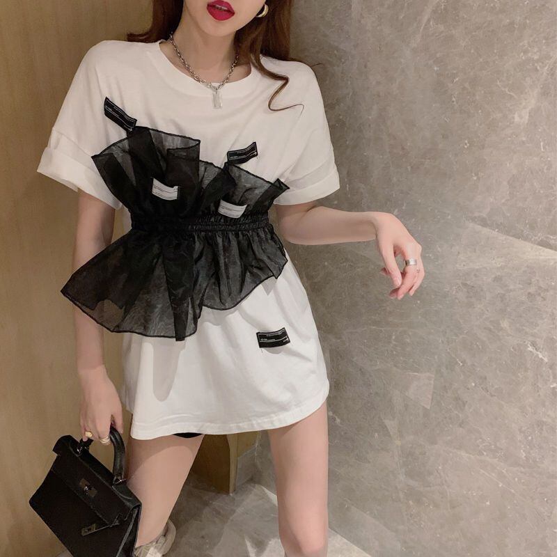 Saymmetrical メッシュパッチワークフェイク 2 ピース Tシャツ O ネックプルオーバー半袖 Tシャツ夏綿トップ Y2k ショート コットン ハーフスリーブ サマー 夏物 Oネック