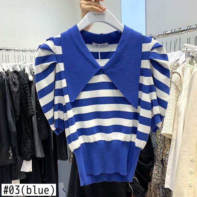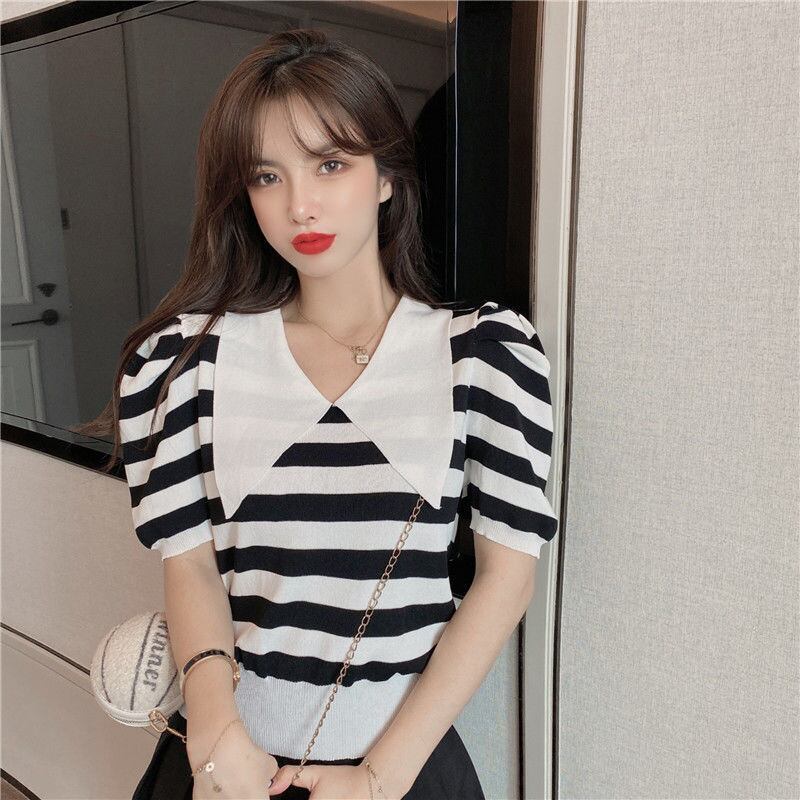 原宿美的クロップトップニットバブル半袖シャツブルーストライプ Tシャツグラフィック Tシャツ Tシャツ ショート ハーフスリーブ かわいい