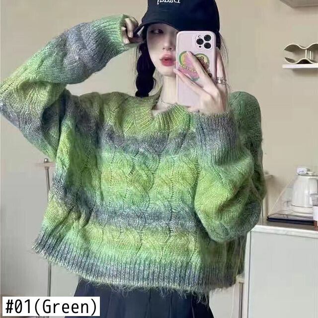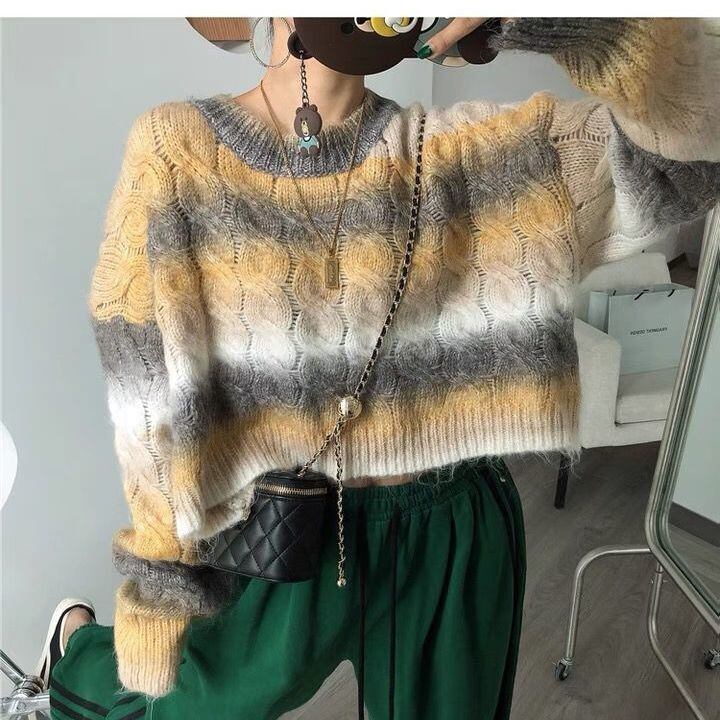 グラデーションカラーツイストソフトセーター秋バージョン O ネックルーズショートニットトップスプル オータム 秋物 Oネック