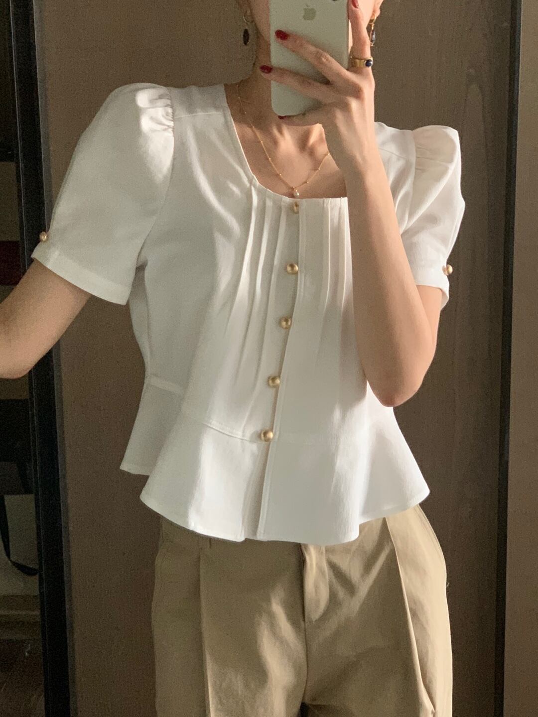 気質スクエアカラープリーツニッチフリルショートシャツクロップブラウススリムシャツ スクウェア