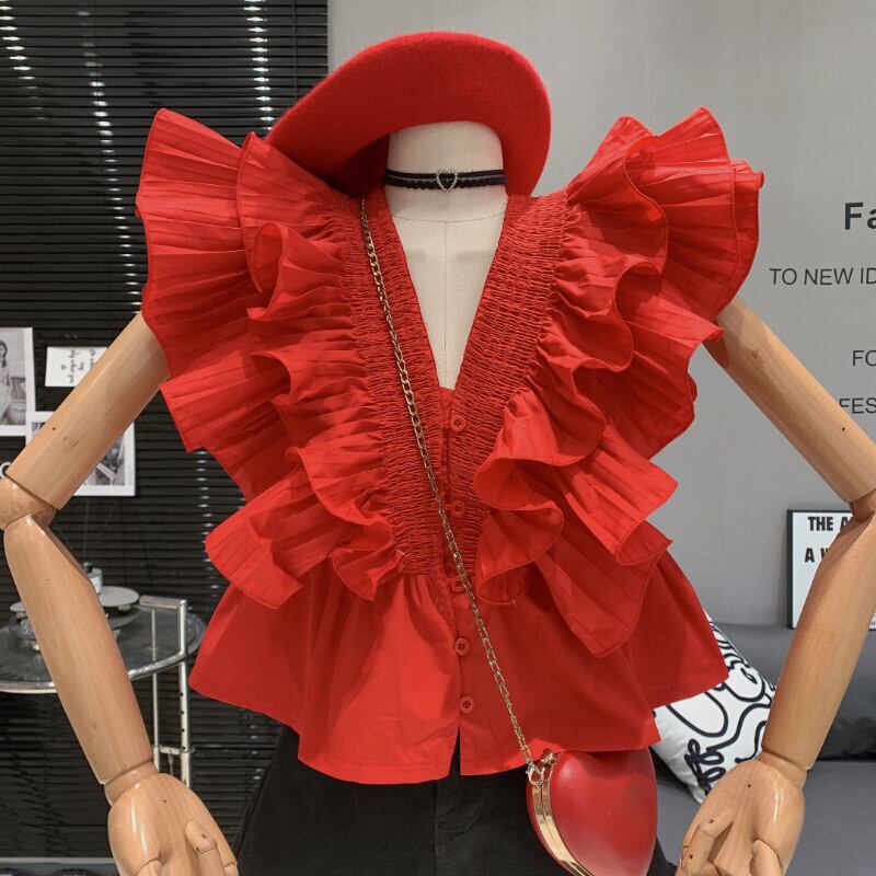 セクシー赤 V ネックブラウス層状フリルノースリーブシフォンシャツウエストクロップトップシャツ白飛行 ホワイト レッド Vネック