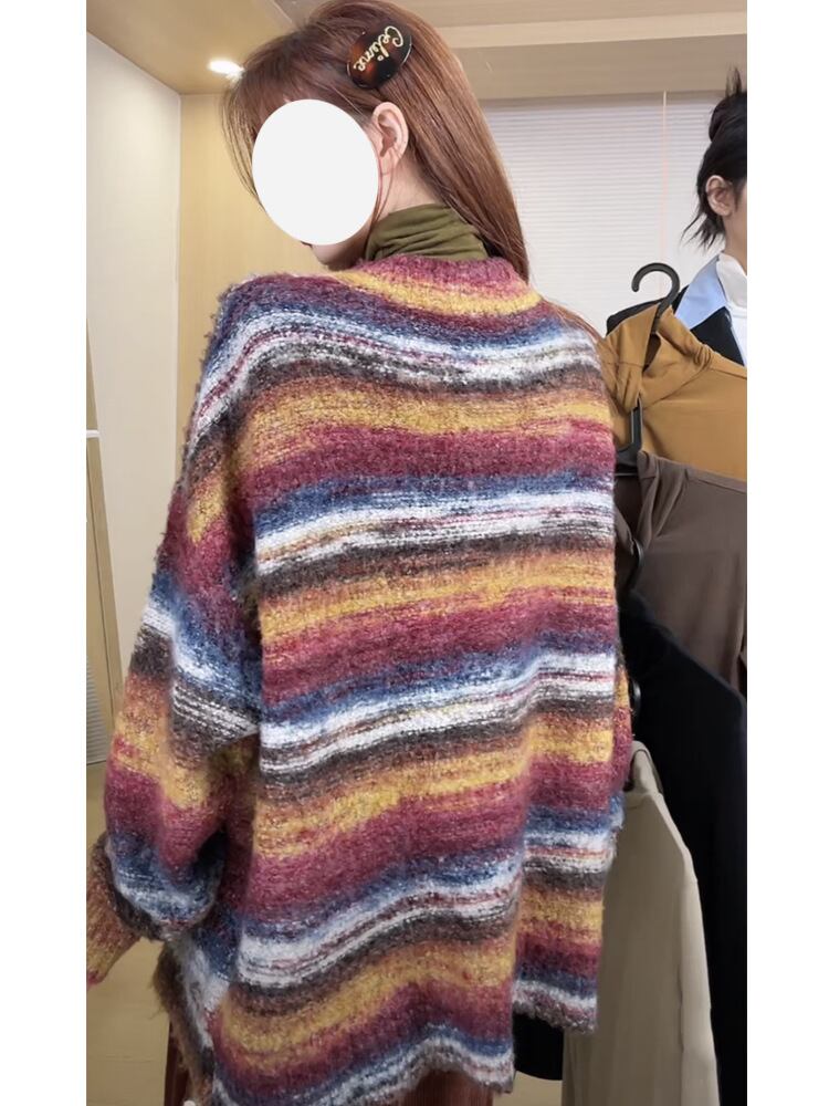 怠惰ルーズフィットニッチ学生カーディガンニットトップジャケットカラーストライプセーターセーター冬コートプル レッド ウィンター 冬物