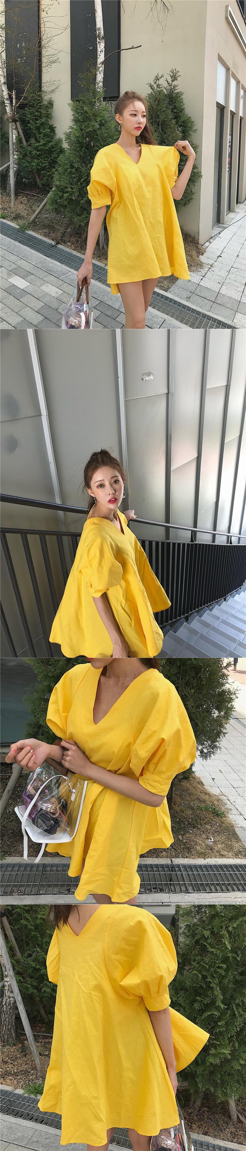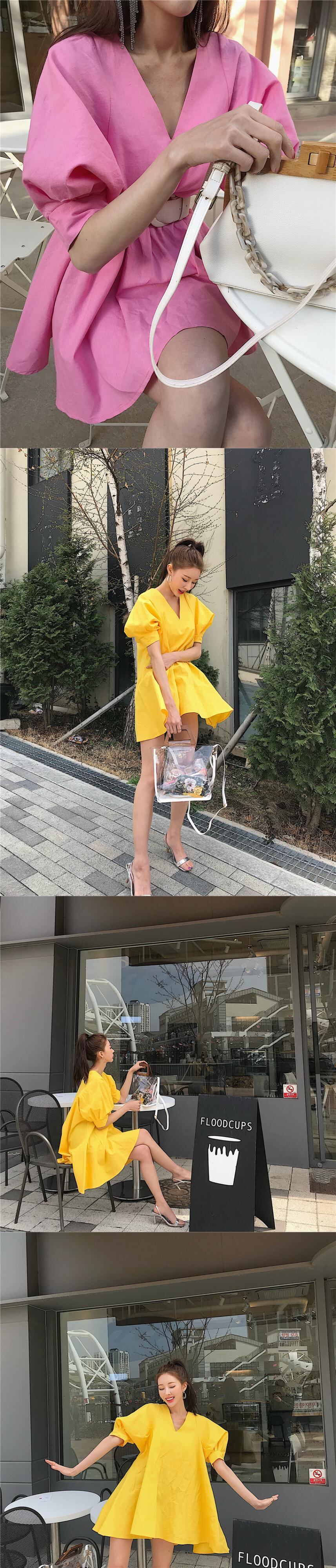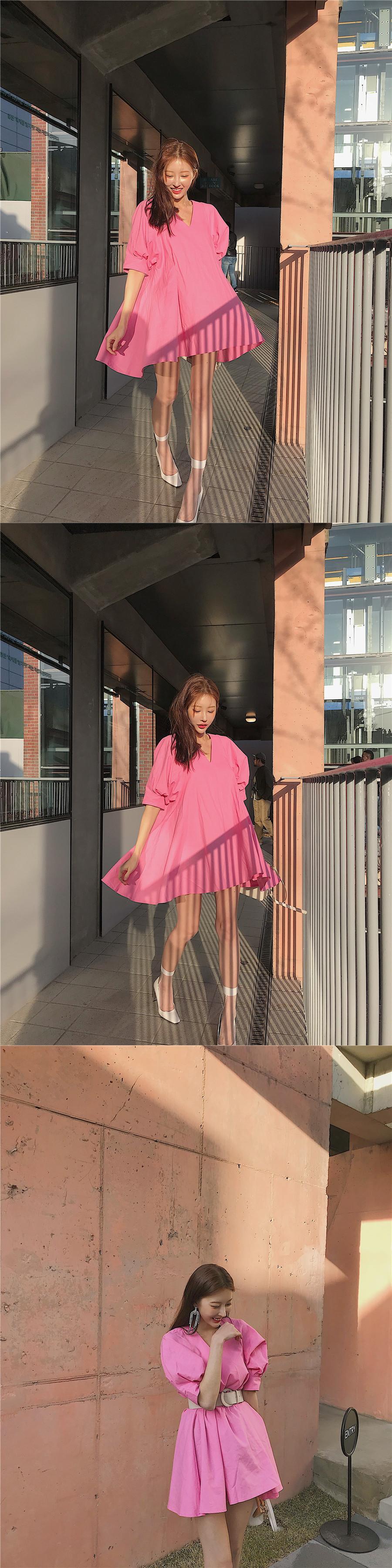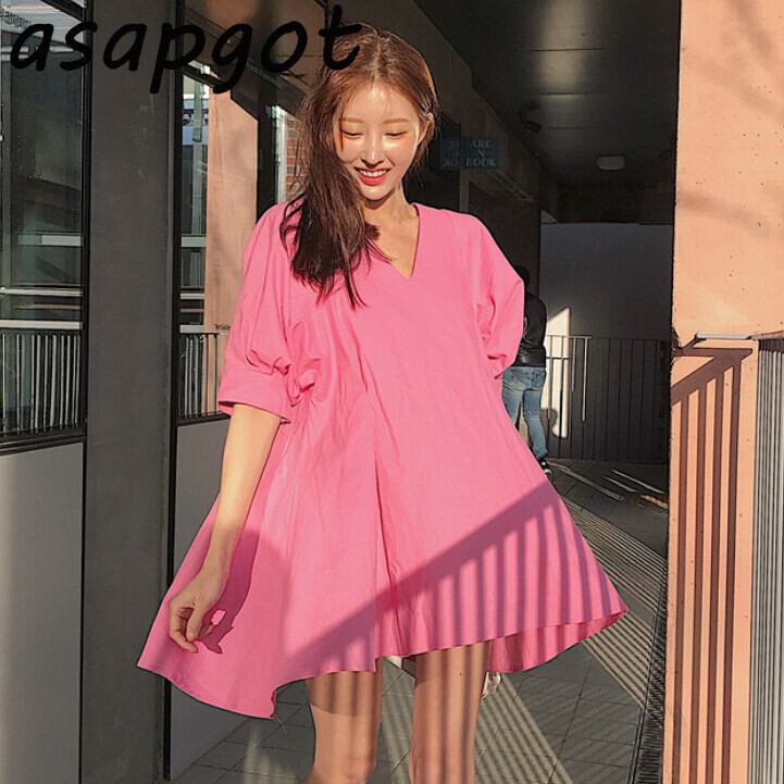 ドレスキャンディーカラーフレッシュルーズ V ネックパフ半袖ドレスショート不規則裾ワイルド Vestido Feminino 甘い ハーフスリーブ 大人ガーリー スウィート キュート カジュアル Vネック