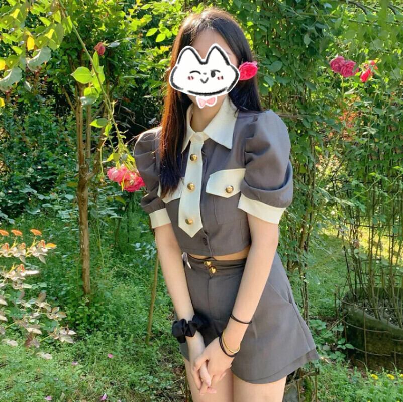 プレッピースタイルミニショーツセットセンストップコントラスト半袖グレーシャツ 2 ピースセットレディース衣装 Y2k セクシーシャツ ショート ハーフスリーブ ブルマー
