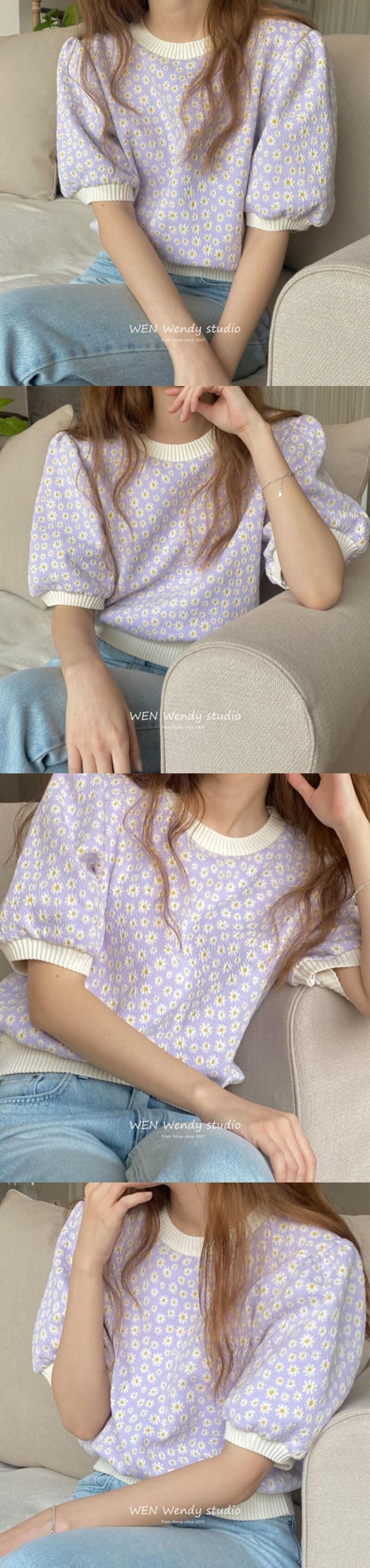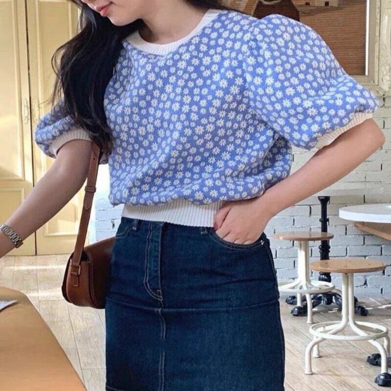 半袖ブルーデイジー Tシャツパフ花柄シャツサマーシャツニットシャツクロップトップスリム Tシャツ ショート ハーフスリーブ 夏物