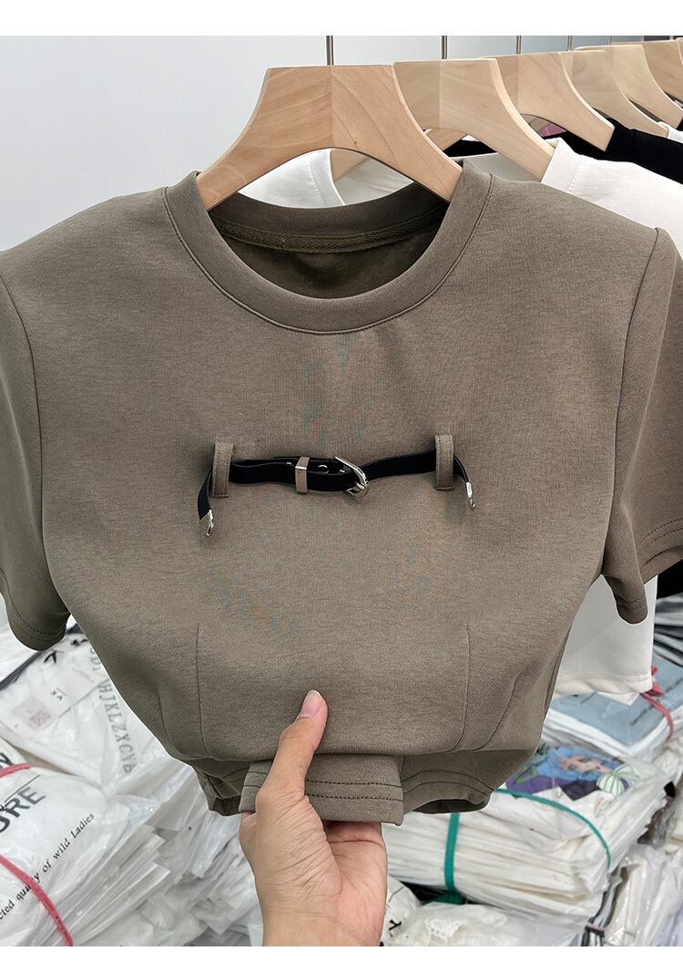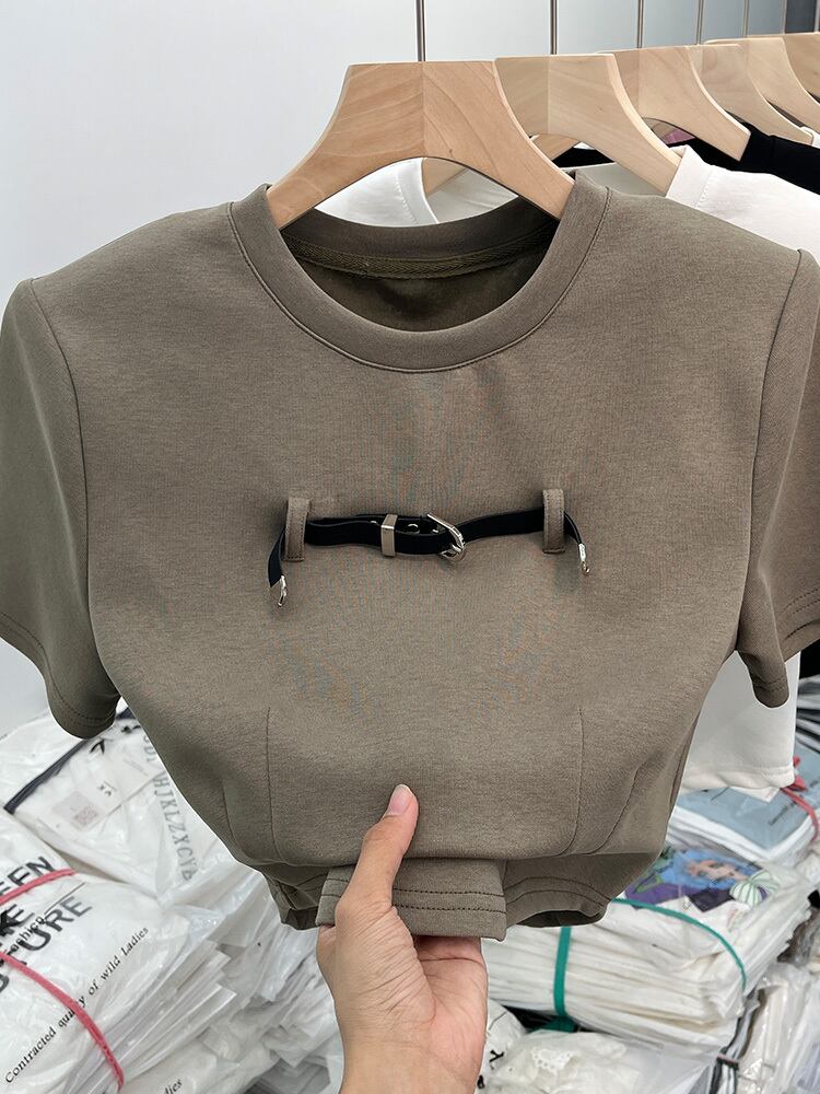 ショルダートップ感覚ニッチ半袖 Tシャツ綿 Y2k 服チェーン Tシャツベルトクロップトップシャツ綿 ショート コットン ハーフスリーブ ハーネス