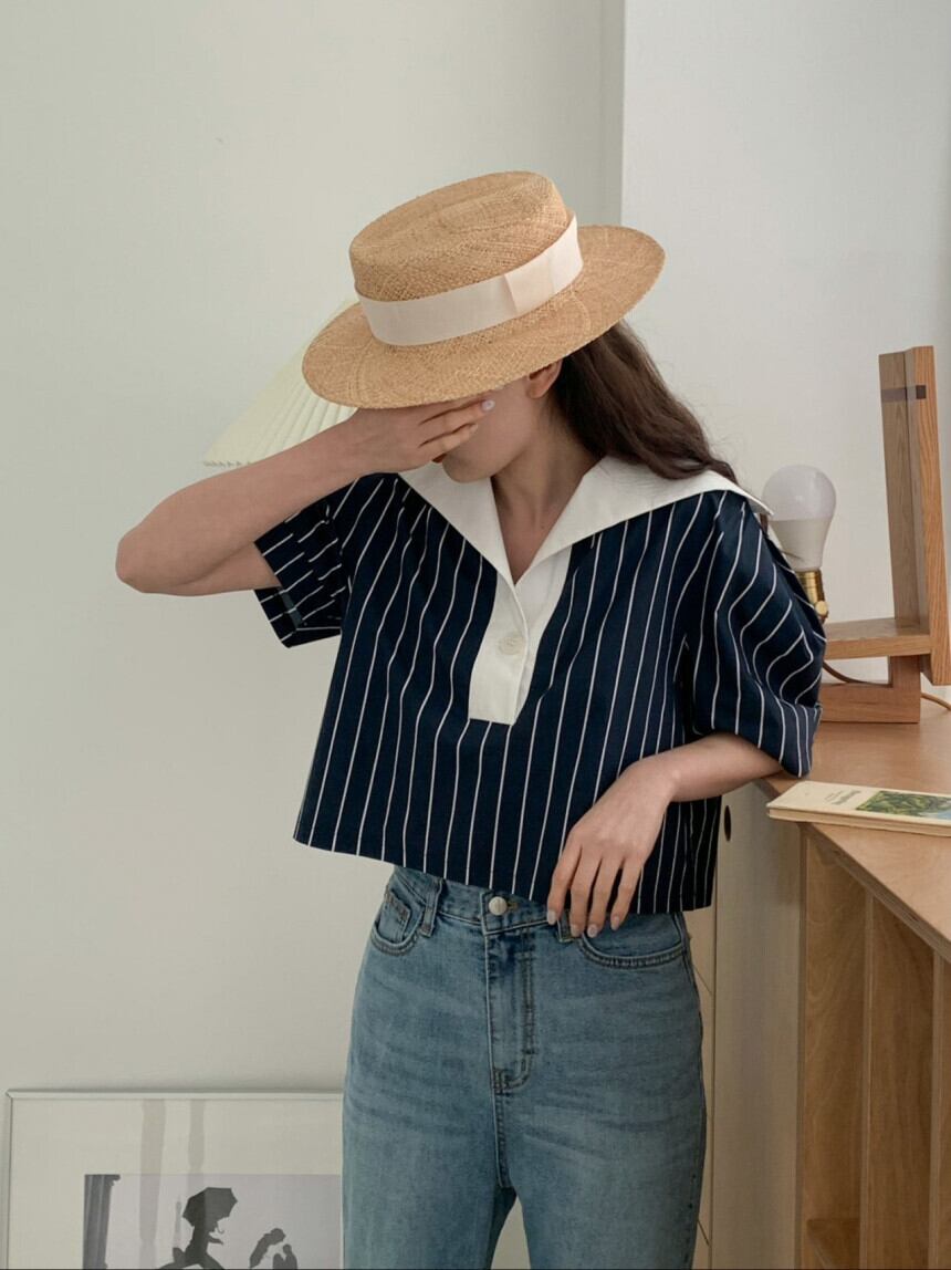 シャツコントラストセーラー襟ブルーストライプ Tシャツルーズ多用途グラフィック Tシャツ原宿トップ かわいい