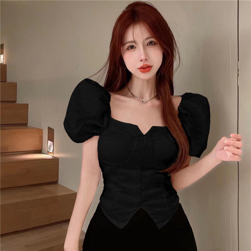 ジャカード刺繍クロップトップフレンチニッチスクエアブラウススリムシャツパフホワイトシャツ スクウェア