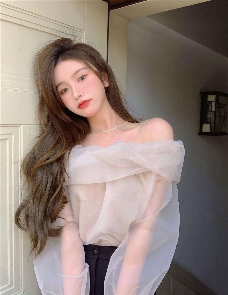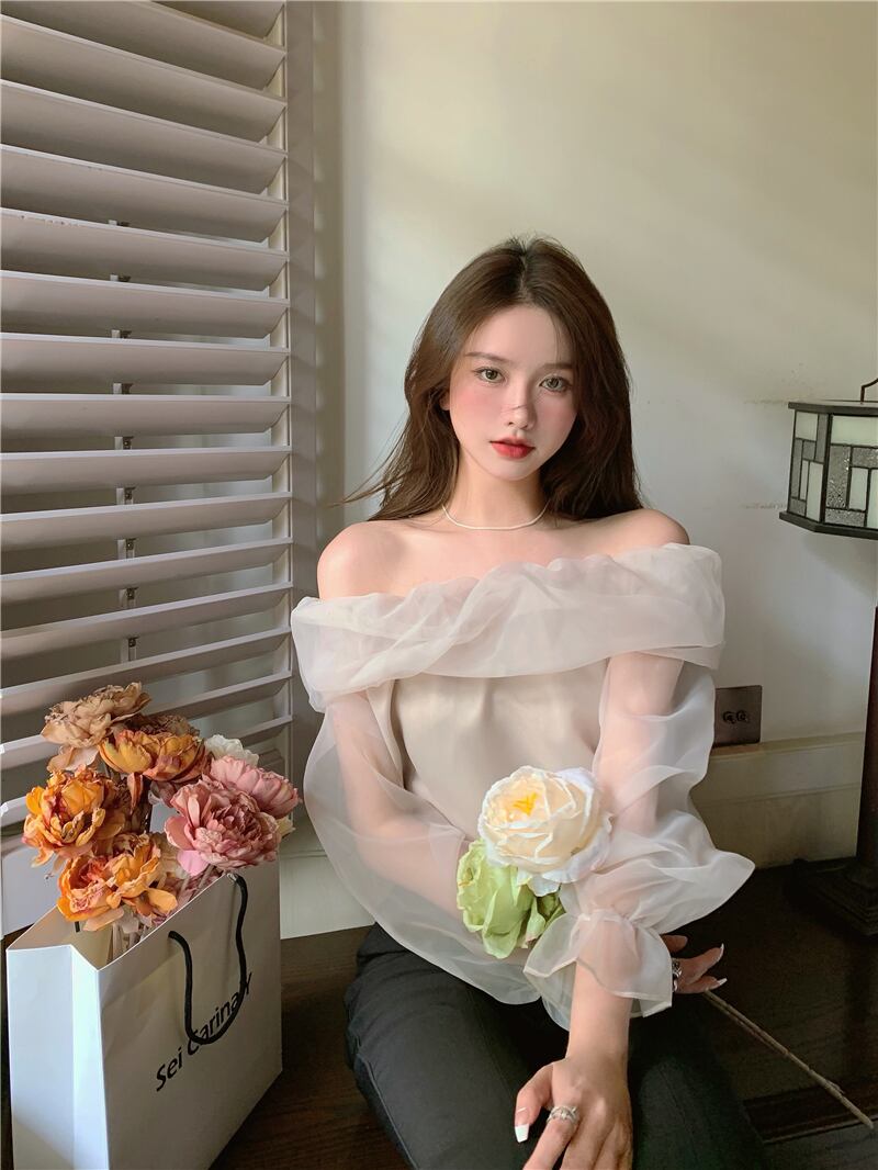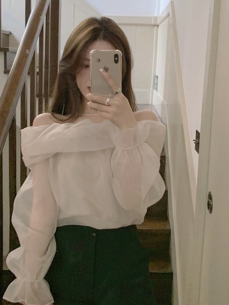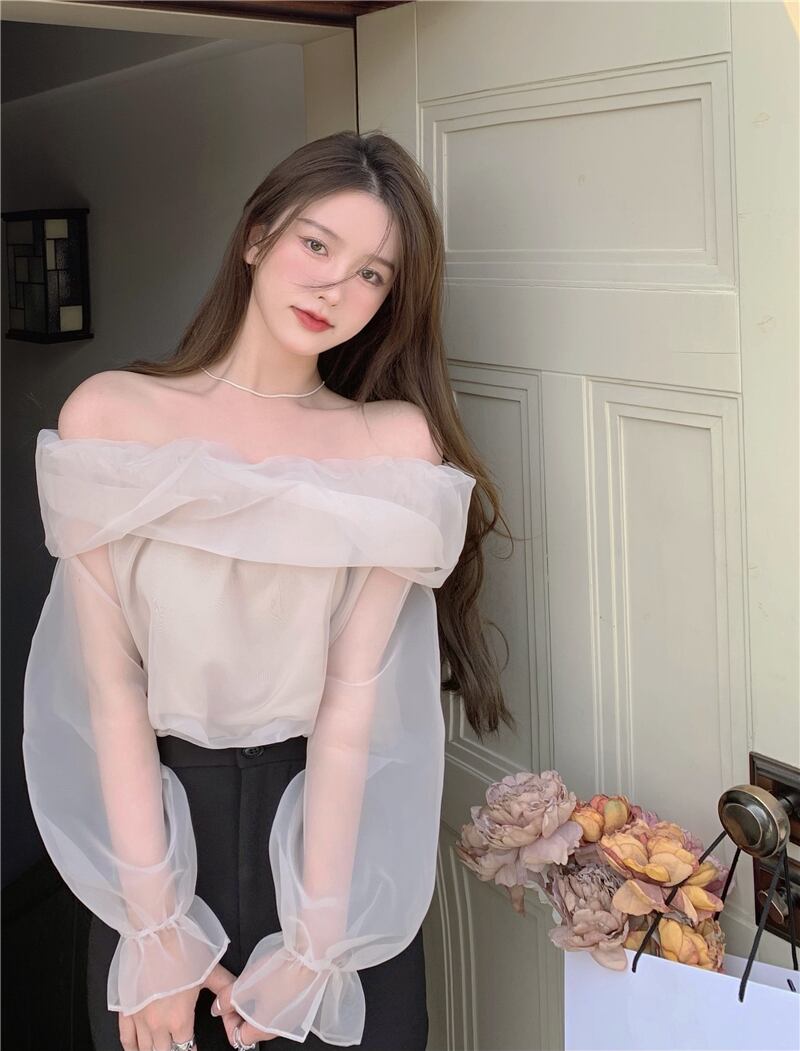 フレンチスイートスラッシュネックメッシュ日焼け止めシャツ長袖オフショルダートップブラウスカミーサシャツスタイル ロング 大人ガーリー スウィート キュート カジュアル