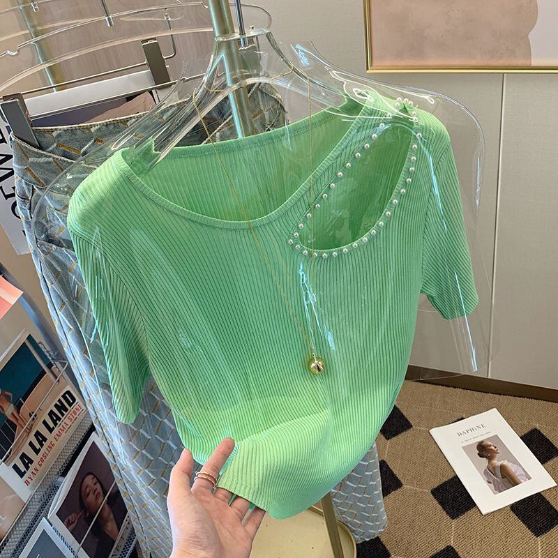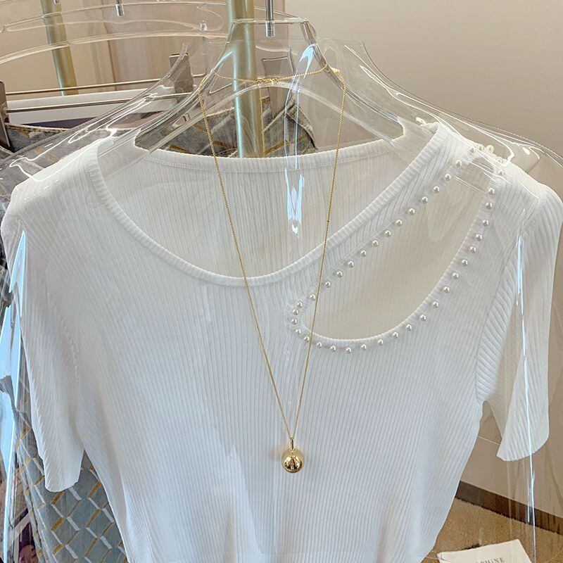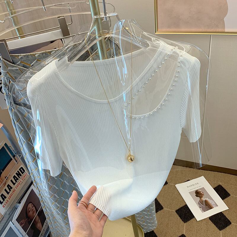 セクシー中空アウトビーズシャツグラフィック Tシャツアイスニットシャツ半袖 Tシャツグランジ Y2k トップ ショート ハーフスリーブ シルク