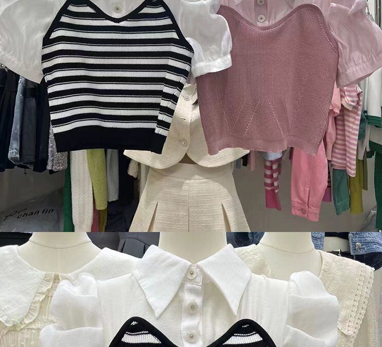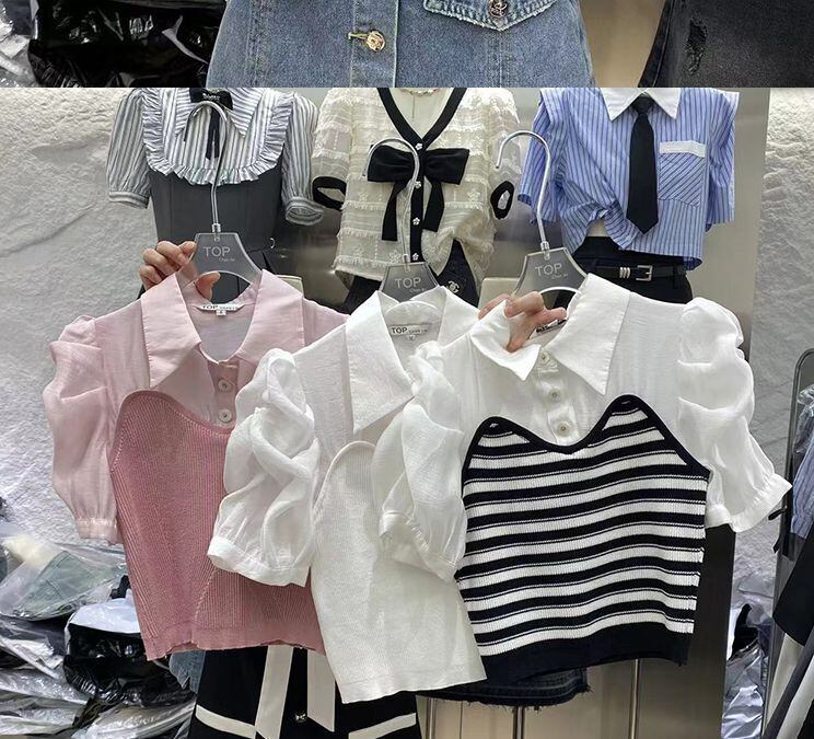 シャツ偽ツートップスステッチニットシャツ原宿グラフィック Tシャツパフ半袖ストライプシャツ Y2k ショート ハーフスリーブ かわいい