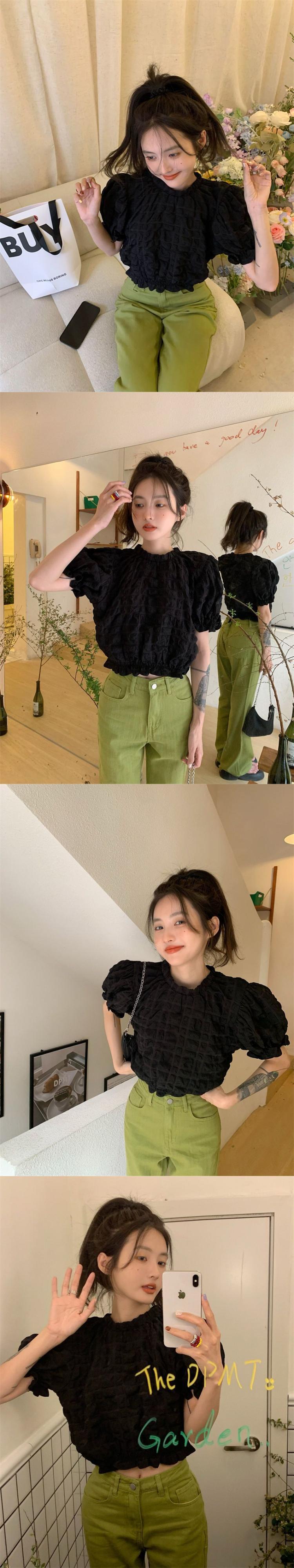ブラウスデモーダパフ半袖クロップトップ白シャツジャカードシャツ夏ワイルド Tシャツ ショート ホワイト ハーフスリーブ サマー 夏物