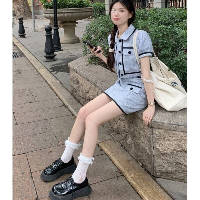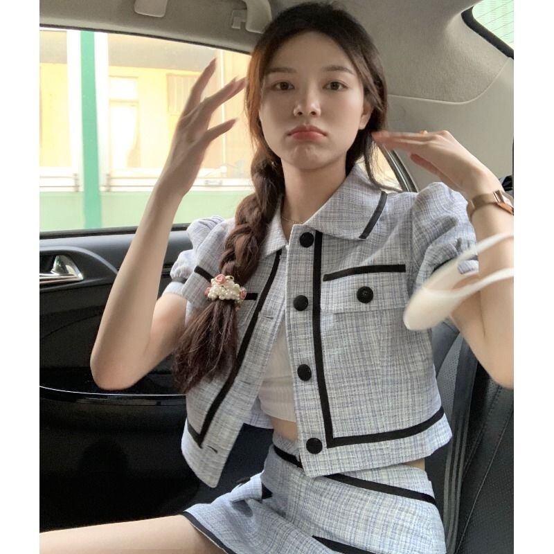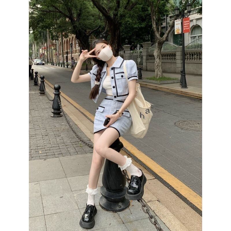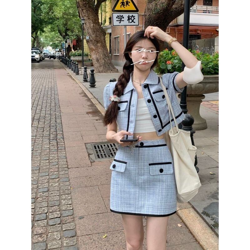 ラペルブルーストライプシャツ半袖ブレザースーツチェック柄カーディガンラップヒップミニスカートセットジャケット春 2 セット ショート ハーフスリーブ スプリング 春物