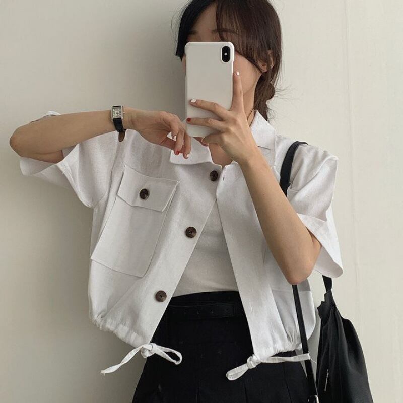 ターンダウン襟巾着白半袖ジャケット原宿配送コートチャケータクロップシャツトップ ショート ホワイト ハーフスリーブ かわいい